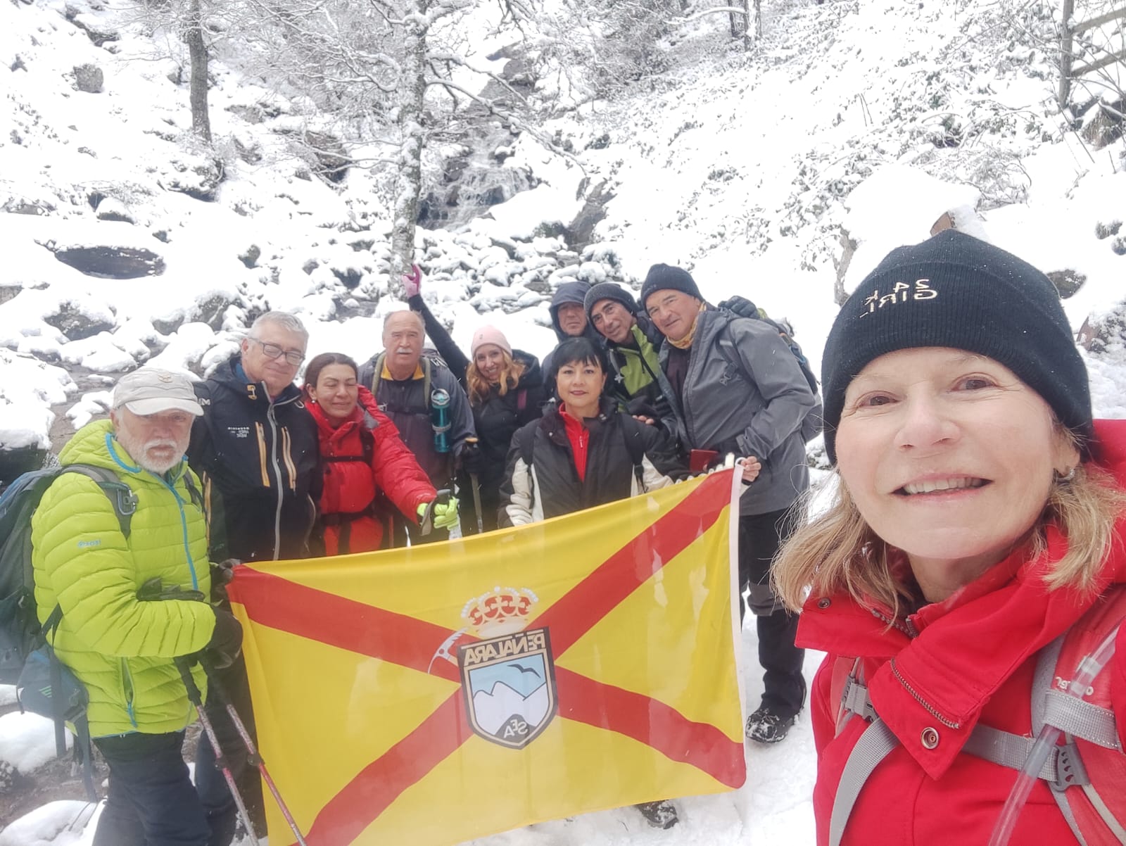 Llegamos a la chorrera de Mojonovalle, que bajaba con bastante caudal y con todas sus orillas repletas de nieve. Tras las fotos de rigor regresamos desandando la andado, llegando en hora al punto de salida, eso sí con un pequeño susto, ya que Paco tuvo bastantes dificultades para encontrar las llaves de su coche.