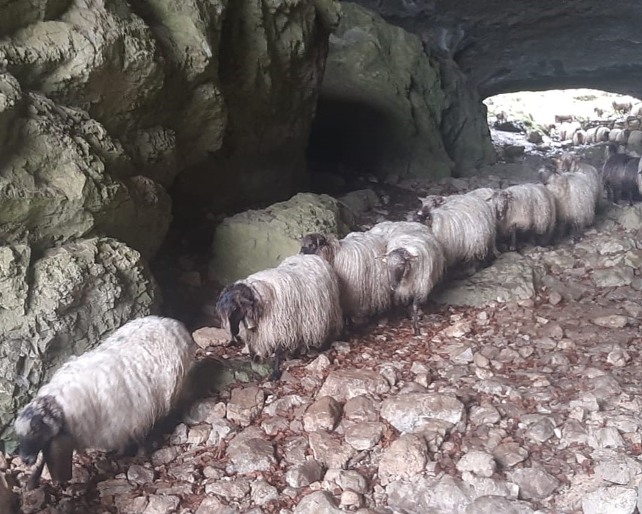 Estando en el interior de la cueva, tuvimos la suerte de ver pasar un rebaño de más de 350 ovejas, guiadas por cuatro pastores, sin la ayuda de ningún perro, en Oñate existe una escuela de pastores.