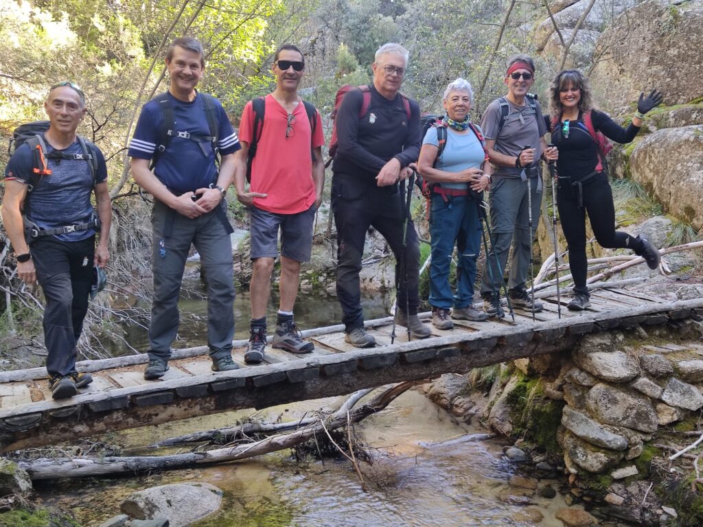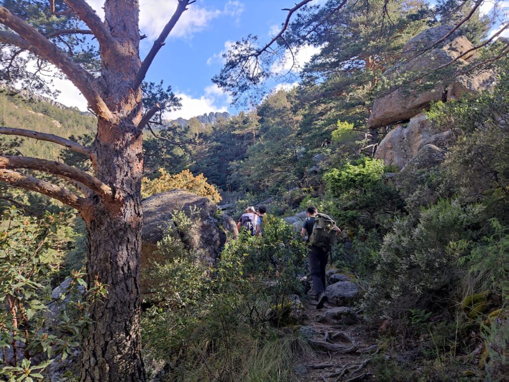 La mañana era fresca y soleada, el ruido del agua y de los pájaros invitaban a caminar con paso ligero los primeros tramos de nuestro camino y el grupo con agilidad fue ganando altura y excepto algún alto para intercambiar anécdotas de nuestras escaladas juveniles en lugares míticos que íbamos divisando por el camino, miradores señalados y poco más llegamos al Collado de la Ventana para hacer parada de 10-15min y seguir nuestro camino en busca de las primeras marcas visibles del PR1 que utilizaríamos como guía el resto de nuestra jornada.