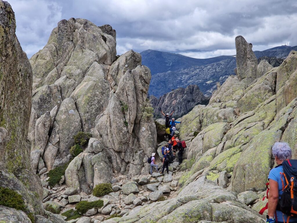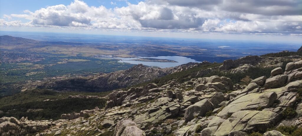 En unos 15 minutos y tras una ligera trepada nos aupamos a un promontorio con vistas privilegiadas al Hueco de San Blas, Embalse de Santillana, Soto del Real y allá al fondo casi al alcance de la mano los edificios cercanos a la Plaza de Castilla. Continuamos sin cambiar de vistas y enseguida encontramos una primera angostura para atravesar unas rocas que cortaban nuestro camino. Coordinando el paso de mochilas y sincronizados como si hubiéramos entrenado este paso salvamos el obstáculo, e incluso alguno buscamos alternativas con trepadas laterales que fuimos solventando sin mucho problema. Sin duda el tamaño de nuestro grupo ayudó a coordinar este paso, Pedro había decidido acertadamente al limitar el número de participantes en la actividad.