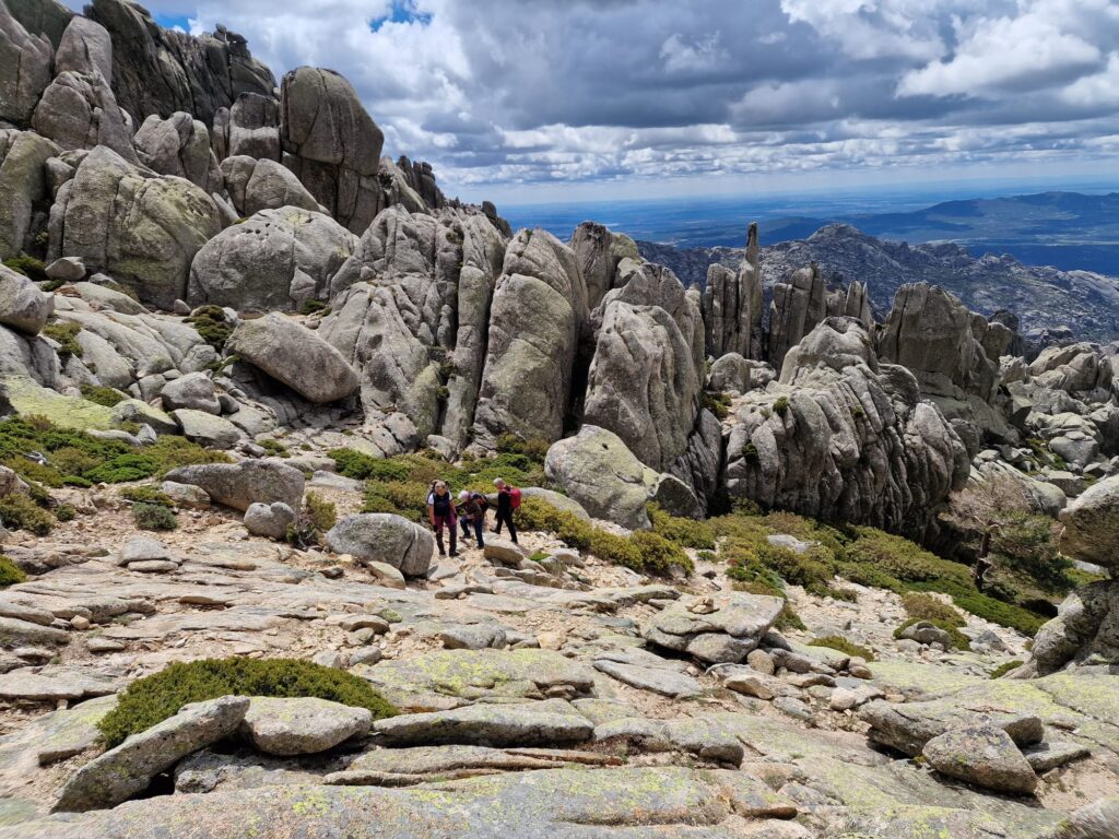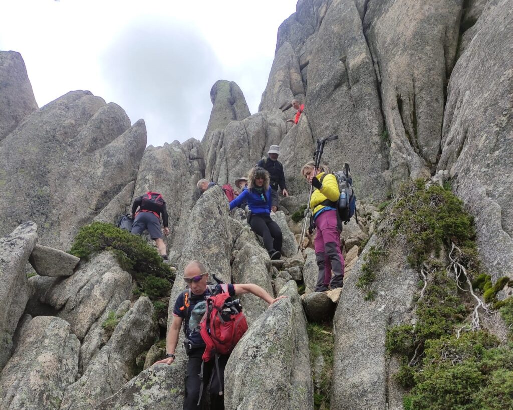 Casi de inmediato una nueva trepada de unos 15-20 metros por una brecha para iniciar de inmediato un destrepe que Pedro aseguró con un par de cintas para evitar resbalones inoportunos. Nuevamente coordinación absoluta y participación de todos los integrantes como si hubiéramos practicado el paso de antemano. A partir de este punto, el camino empieza a ser un sube y baja con algo de laberinto que las marcas del PR nos ayudan a descifrar. Nos cruzamos con el Callejón de las Abejas, La Esfinge, El Loro, vistas alternativas a un lado y otro de la línea formada por las Torres amenizan nuestro trayecto, llegamos al Risco del Ventanillo, y seguimos a buen paso a la cara norte de las Torres. Este tramo es un mirador privilegiado de la Cuerda Larga con Peña Lindera y el Collado de Matasanos en primer plano y toda la Cuerda a su espalda.