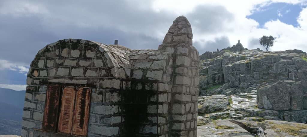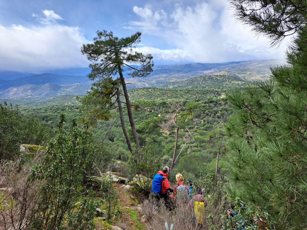 Empezamos a subir por pista forestal hasta el collado del risco del Gelechal. No es un camino fatigoso ni requiere de un esfuerzo notable, lo que favorece el cruce de agradables y entretenidas conversaciones. Una vez en el Collado descendemos hasta el fondo del valle donde hacemos una breve parada para reponer fuerzas. El paisaje es espectacular, un bosque de encinas, pinos, jaras y romero en flor nos va envolviendo y hace que la ruta se transforme en una sorpresa general.