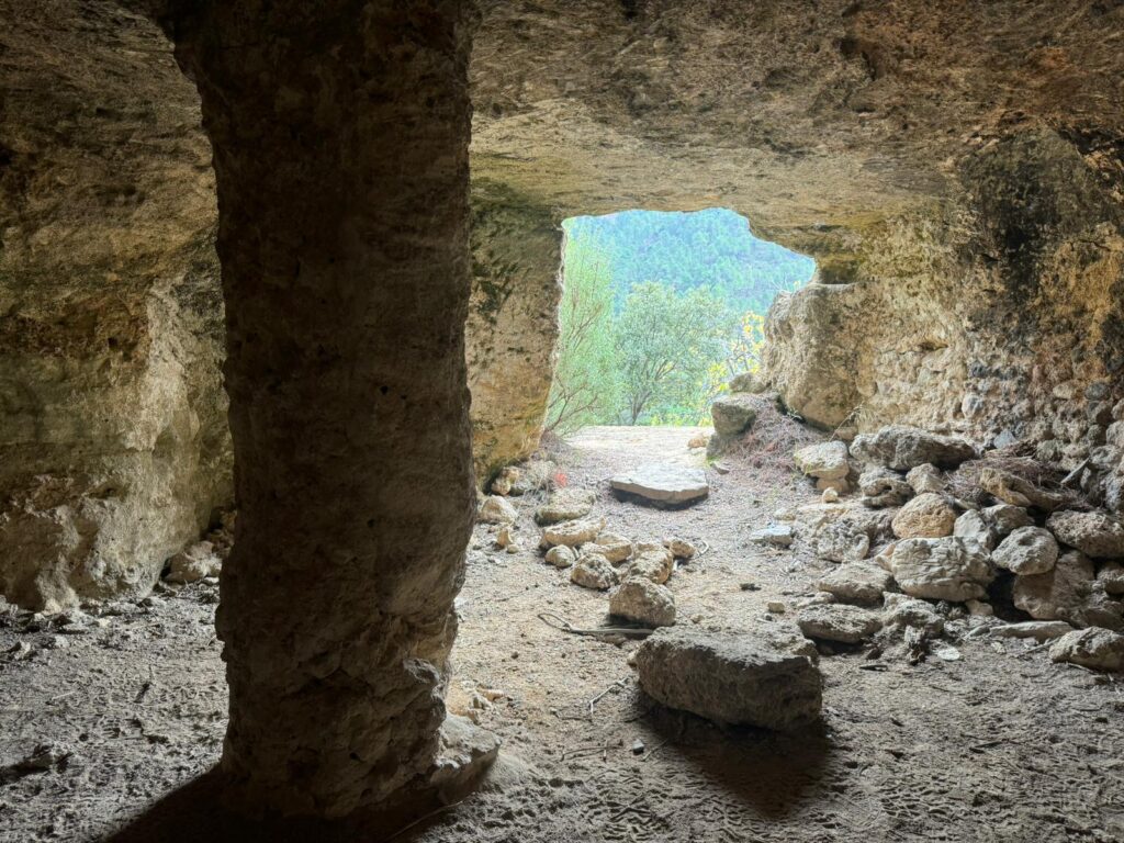 Rodeados por los colores otoñales de chopos, higueras y cornicabras fuimos ganando altura hasta el puesto de avituallamiento de las cuevas del Tío Ratón. Son éstas unas curiosas cavidades excavadas en la roca caliza donde habitaba ese personaje antaño. El avituallamiento lo hicimos en las higueras y granados que por allí encontramos.