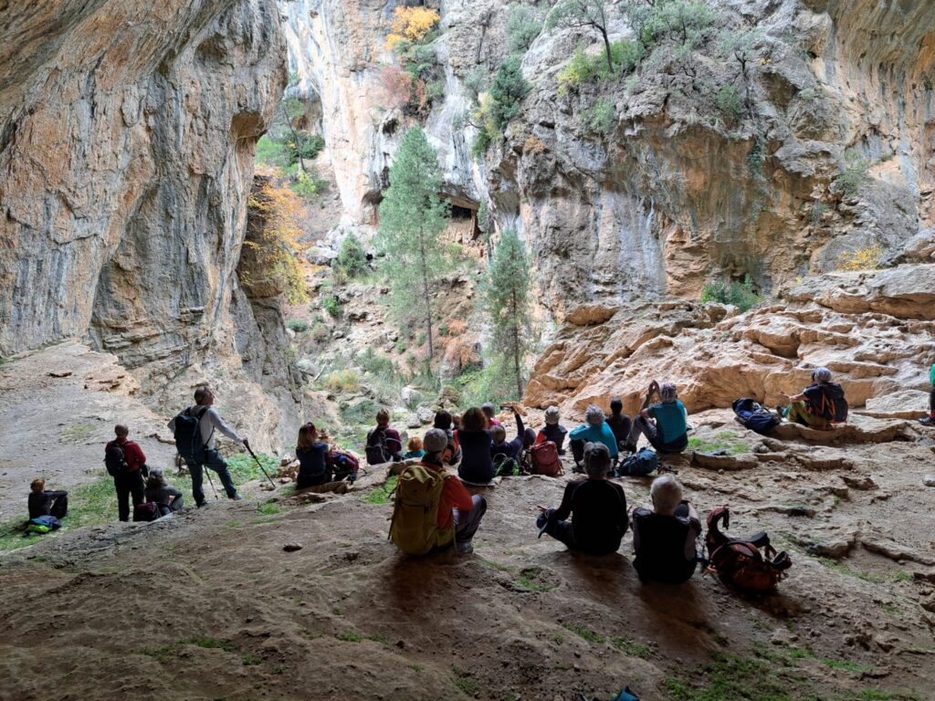 En el punto de mayor altitud del recorrido llegamos al paraje más impresionante de la ruta: una enorme oquedad formando un espectacular balcón sobre el barranco del arroyo de la Graja. Allí, animados por Paloma, guardamos todos un relajante minuto de silencio disfrutando de la serenidad de aquel lugar.