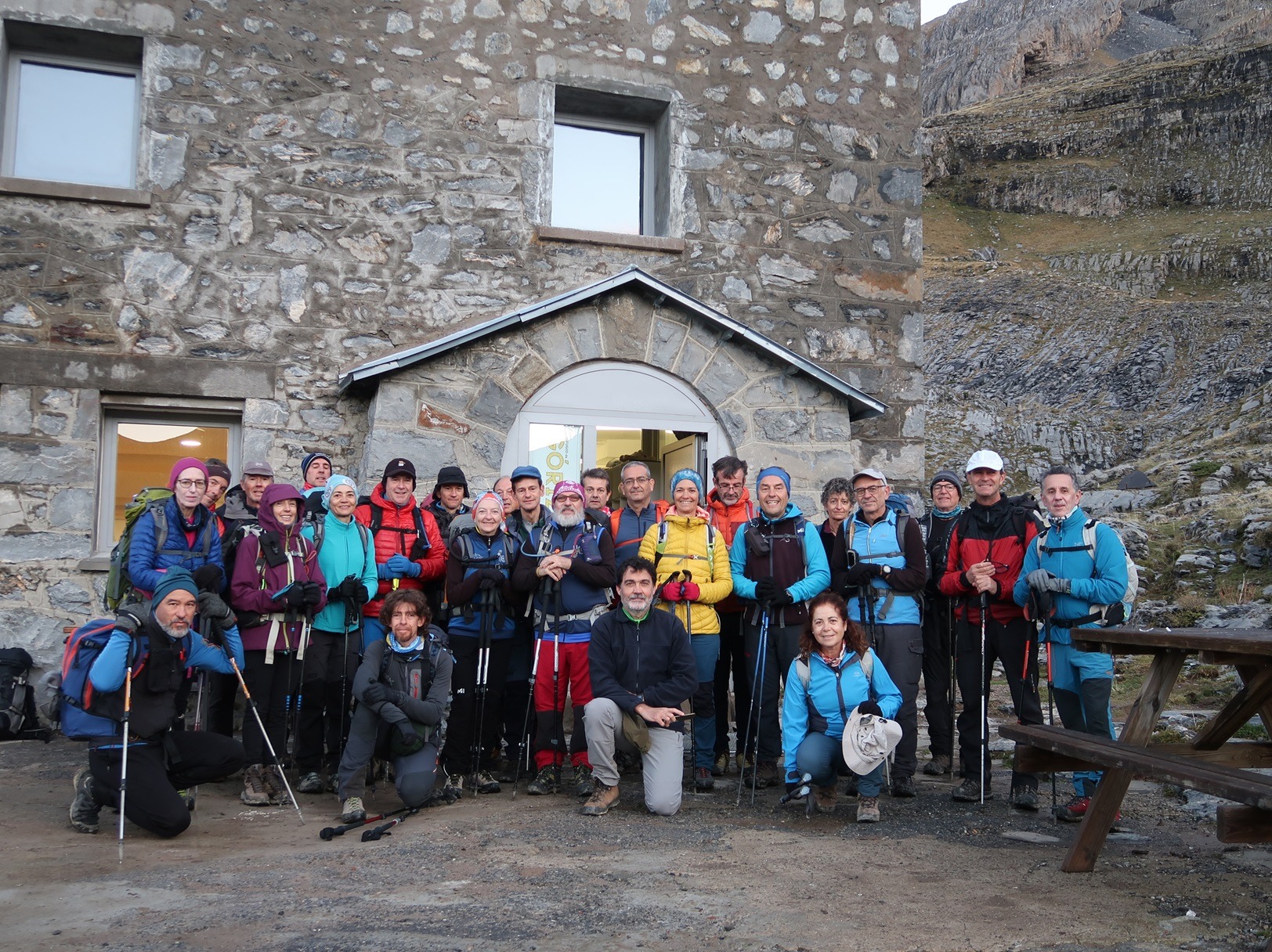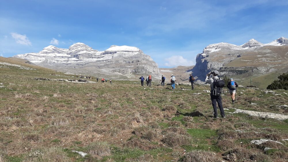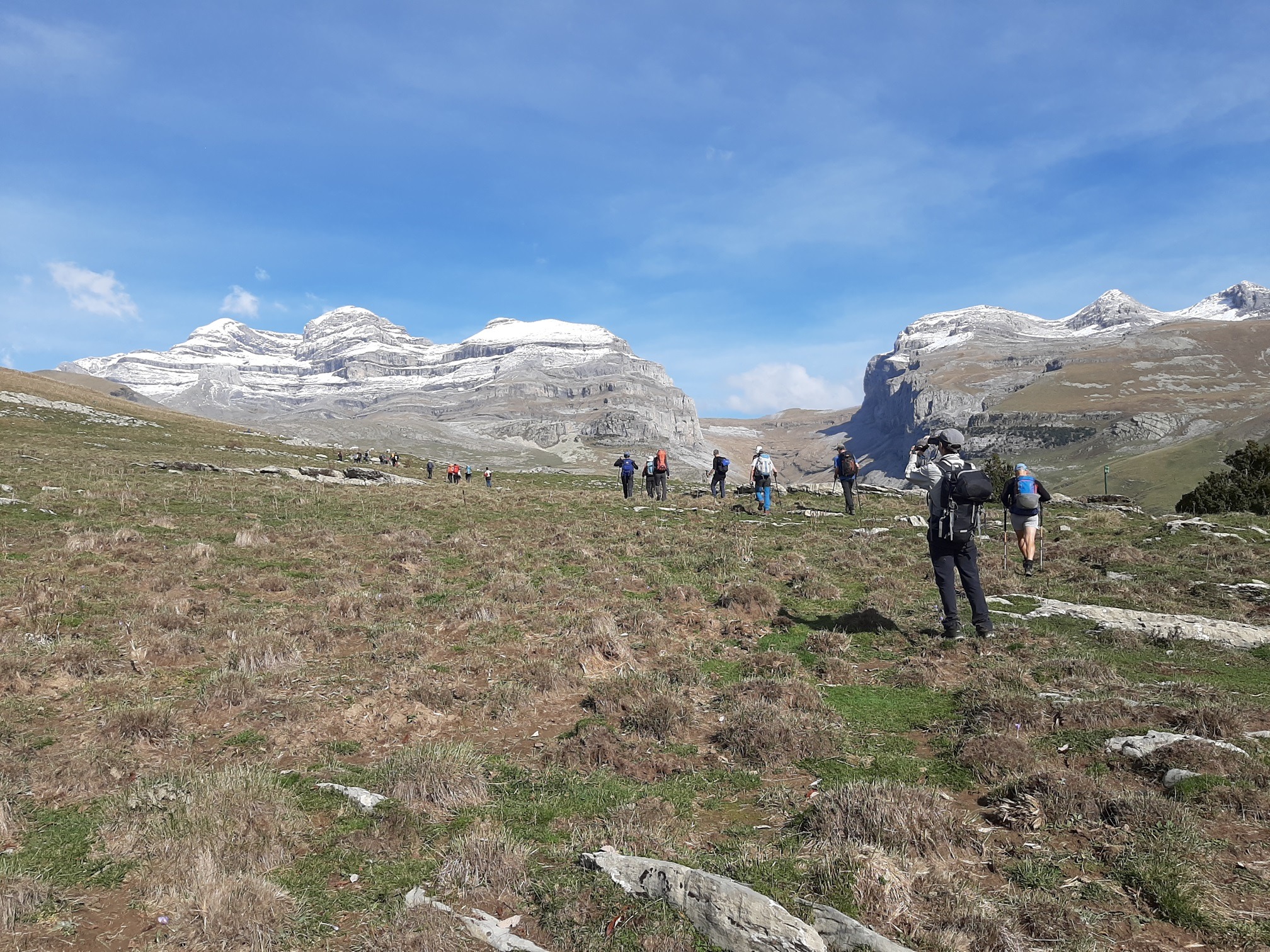 El sábado se presenta despejado, limpio y templado. El principio de la jornada nos obliga a transitar por una pista que a veces atrochamos por sendas hasta subir al Cuello Arenas (1900 metros). A partir de ahí, se nos presentan en todo su esplendor los altos picos del Parque Nacional, nevados en la parte superior a bandas, con el contraste de un cielo azulísimo que nos para a cada momento para contemplarlo y hacer fotos. La senda discurre hacia el norte por un páramo alto, herbáceo, que atraviesa una construcción toda en piedra y luego gira al noroeste hasta tropezarnos con la parte alta del cañón de La Pardina, que rodeamos para bajar en dirección este a su hermosa faja, que nos va deteniendo a cada instante por la belleza de las cascadas y cortinas de agua que atravesamos, por el espacio del cañón que cae a plomo a nuestra derecha. Nos cuesta…, nos cuesta seguir avanzando. En el vértice de la confluencia con el cañón de Añisclo nos paramos y, desde ese magnífico balcón, admiramos la profunda hendidura, desde su nacimiento hasta Sestrales. La faja Pardina termina y nos obliga a una empinada subida en dirección oeste hacia la Majada Candón (1810 metros), a partir de la cual el paisaje se vuelve suave en sus formas ascendentes hasta la Sierra Custodia. En la parada para comer, advertimos la amenaza que se cierne en el cielo al sureste, que parece que nos alcanzará y nos mojará antes de llegar al refugio de Góriz, en un cielo que se nubla por momentos, impidiéndonos ver las Tres Sorores, con riesgo de entrada de niebla. Pese a ello, la amenaza no se concreta y nos deja subir lentamente por la alomada cuerda hasta Peña Custodia y un poco más alto a la Punta Custodia (2519 metros), punto más alto del día, desde donde bajamos al Collado superior de Góriz (2343 metros), justo debajo del Morro de Arrablo. A partir de ahí, el descenso a nuestro destino se hace fácil y rápido. El refugio de Góriz nos espera con su reforma finalizada, casi tan larga como la de El Escorial, pero con resultados más modestos. En total, esta jornada ha sido de, aproximadamente, 8:30 horas de actividad, 18 km, y un desnivel de 1500 metros positivos y 585 metros negativos.