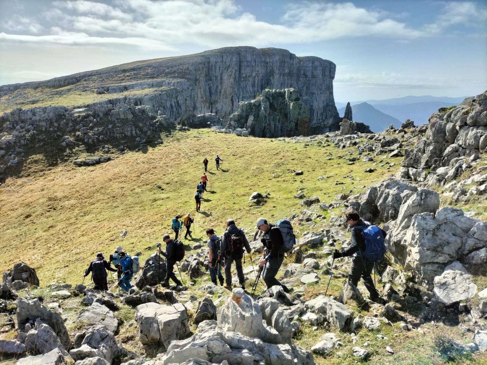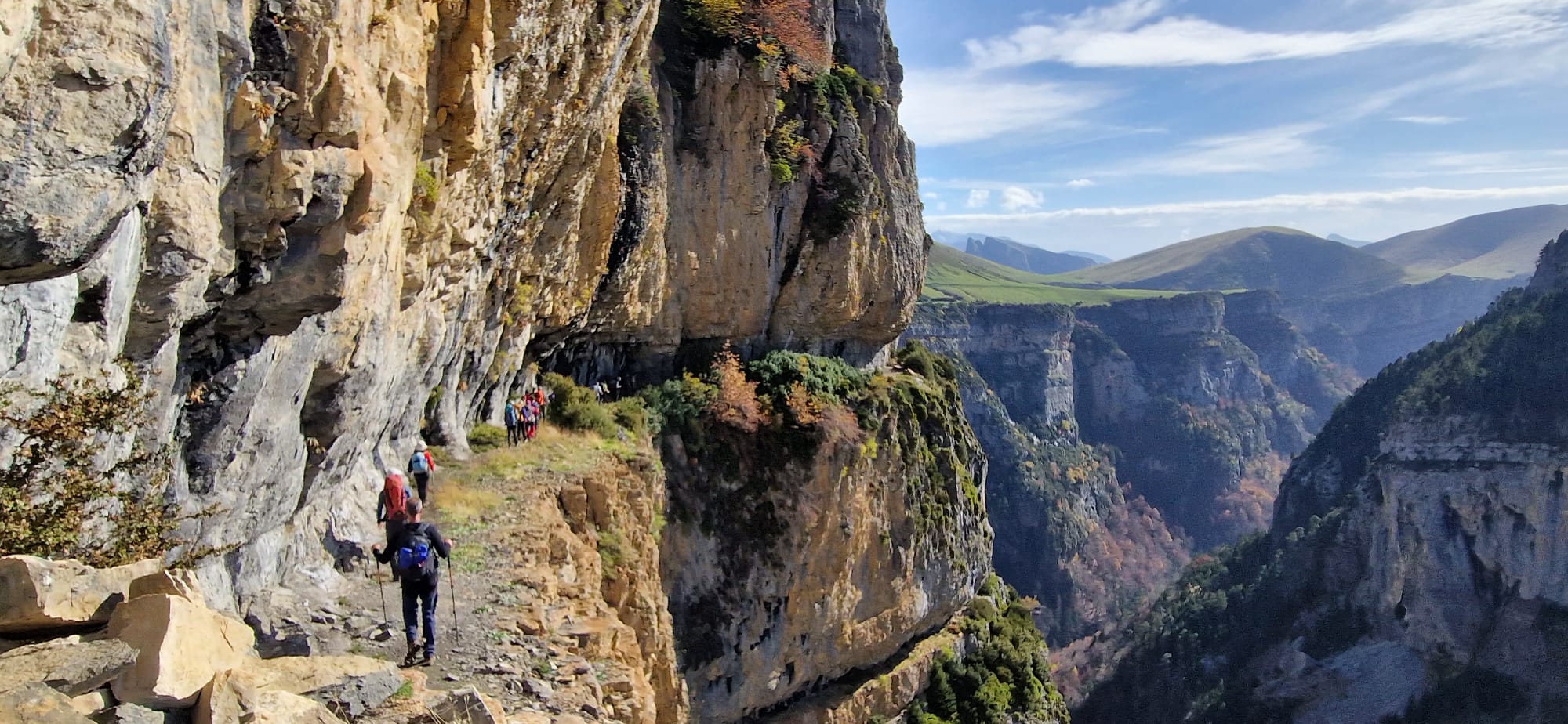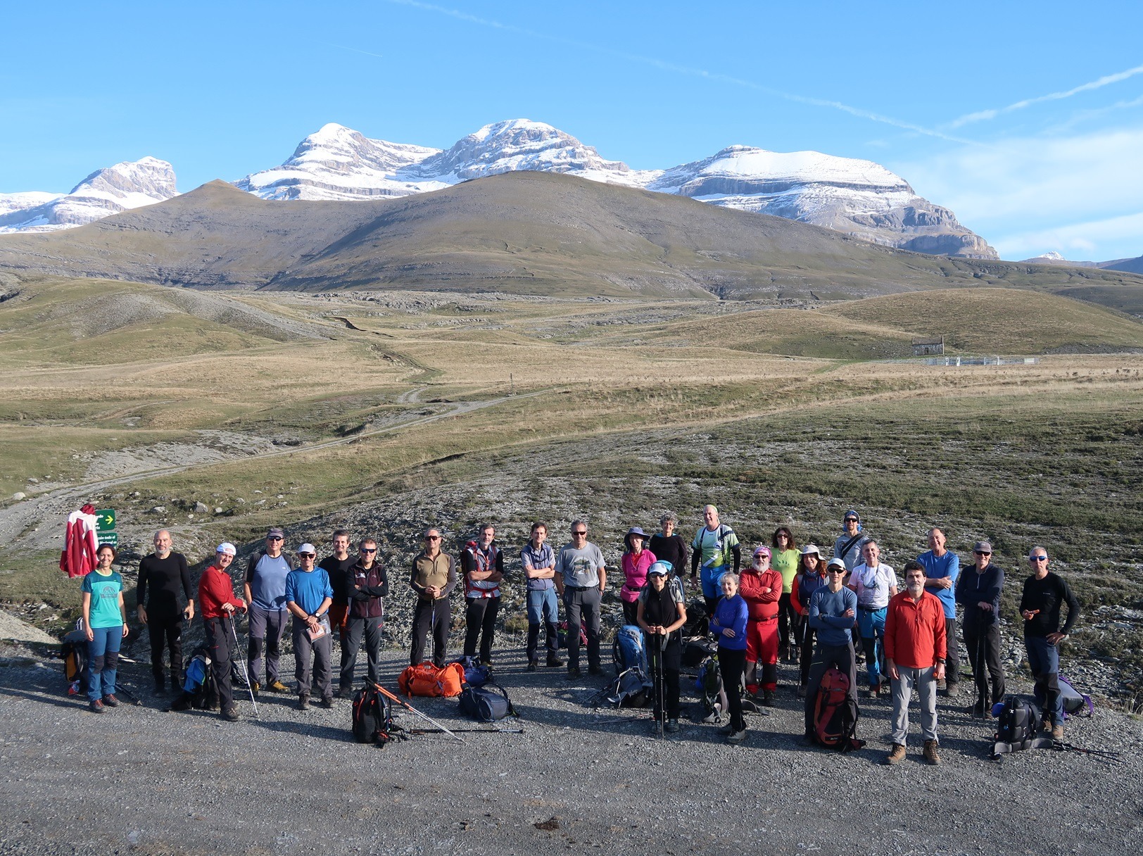 El sábado se presenta despejado, limpio y templado. El principio de la jornada nos obliga a transitar por una pista que a veces atrochamos por sendas hasta subir al Cuello Arenas (1900 metros). A partir de ahí, se nos presentan en todo su esplendor los altos picos del Parque Nacional, nevados en la parte superior a bandas, con el contraste de un cielo azulísimo que nos para a cada momento para contemplarlo y hacer fotos. La senda discurre hacia el norte por un páramo alto, herbáceo, que atraviesa una construcción toda en piedra y luego gira al noroeste hasta tropezarnos con la parte alta del cañón de La Pardina, que rodeamos para bajar en dirección este a su hermosa faja, que nos va deteniendo a cada instante por la belleza de las cascadas y cortinas de agua que atravesamos, por el espacio del cañón que cae a plomo a nuestra derecha. Nos cuesta…, nos cuesta seguir avanzando. En el vértice de la confluencia con el cañón de Añisclo nos paramos y, desde ese magnífico balcón, admiramos la profunda hendidura, desde su nacimiento hasta Sestrales. La faja Pardina termina y nos obliga a una empinada subida en dirección oeste hacia la Majada Candón (1810 metros), a partir de la cual el paisaje se vuelve suave en sus formas ascendentes hasta la Sierra Custodia. En la parada para comer, advertimos la amenaza que se cierne en el cielo al sureste, que parece que nos alcanzará y nos mojará antes de llegar al refugio de Góriz, en un cielo que se nubla por momentos, impidiéndonos ver las Tres Sorores, con riesgo de entrada de niebla. Pese a ello, la amenaza no se concreta y nos deja subir lentamente por la alomada cuerda hasta Peña Custodia y un poco más alto a la Punta Custodia (2519 metros), punto más alto del día, desde donde bajamos al Collado superior de Góriz (2343 metros), justo debajo del Morro de Arrablo. A partir de ahí, el descenso a nuestro destino se hace fácil y rápido. El refugio de Góriz nos espera con su reforma finalizada, casi tan larga como la de El Escorial, pero con resultados más modestos. En total, esta jornada ha sido de, aproximadamente, 8:30 horas de actividad, 18 km, y un desnivel de 1500 metros positivos y 585 metros negativos.
