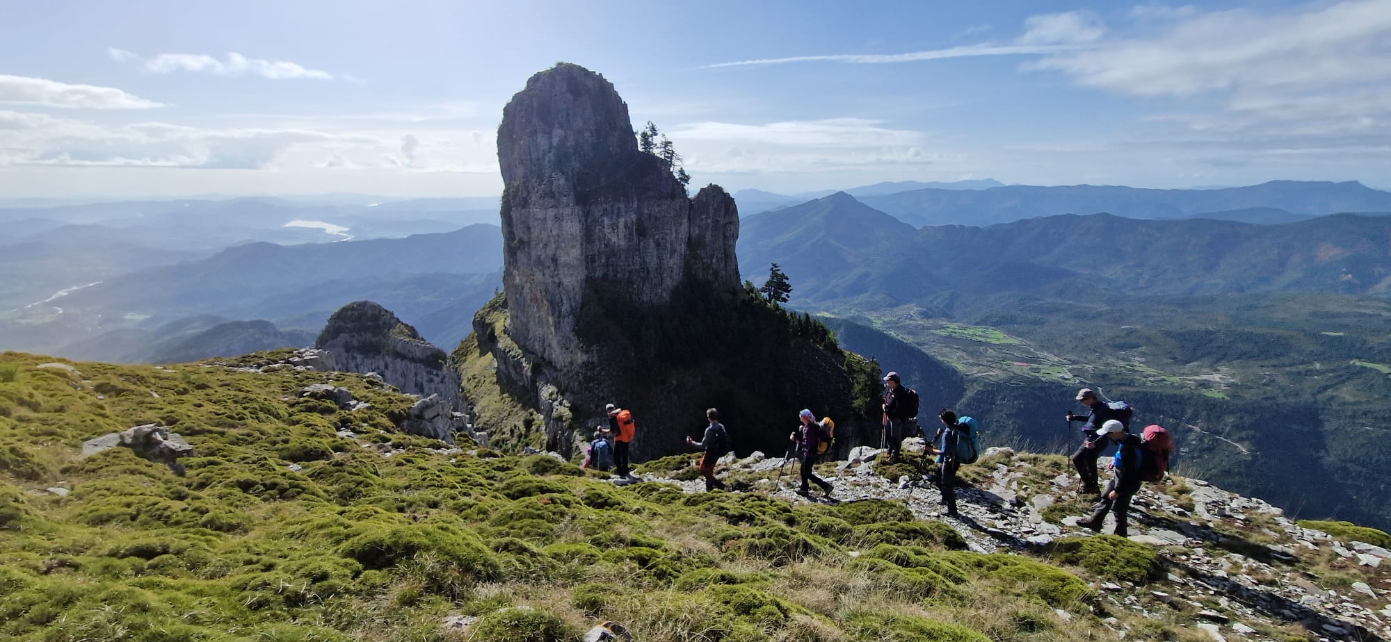 La mañana del viernes amanece mayormente despejada, con un poco de fresquito al inicio, con nubes agarrándose a la parte alta de las Tres Sorores y las Tres Marías del Parque Nacional, que impiden su visión, aunque disfrutamos de sol todo el día. Partimos todos de la plaza de Bestué en los furgones y coches sobre las 7.45h, y confirmamos el mal estado de la pista debido a las abundantes lluvias de este otoño, cruzándonos con vacas deseosas de bajar de la montaña, paradas en los pasos canadienses que lo impiden. Tras la oportuna foto de grupo en el collado de Plana Canal, comenzamos la subida por las suaves lomas herbáceas que ascienden por su lado noreste a Sestrales (2101m), guardián supremo del cañón de Añisclo, sobre el que cae de forma abrupta por su vertiente sur y oeste. El cañón es un tajo profundo que, partiendo en el norte del collado homónimo, en brecha amplia que separa las grandes alturas, vira hacia el este a su paso por Sestrales, que en su parte superior presenta una amplia meseta de roca caliza y praderas. Tras admirar el amplio panorama que se contempla desde arriba y reponernos con el oportuno tentempié, nos desplazamos suavemente hacia el este por la meseta superior para, en un momento, sin miramientos, bajar decididamente hasta el collado de Los Pueyos, desde el que se divisa, allá al fondo, muy lejos, el río Bellós, donde tenemos que bajar en un descenso vertiginoso que se complica por el terreno pedregoso que a cada paso arriesga la caída de piedras y de los participantes por la humedad del piso. Al principio, por estas circunstancias y algún paso arriesgado que obliga a poner una cinta, el descenso se hace lento hasta el punto de apercibirnos de que no llegaríamos de día a Nerín, pero afortunadamente de forma cuidadosa y constante vamos descendiendo a mejor paso y adentrándonos en un bosque mixto de pinos negros y hayas hasta alcanzar el fondo, por donde transcurrimos en plano 2 por un amplio camino transitado que pasa por la ermita de San Úrbez (990 metros) y atraviesa el río por un puente, tras el cual volvemos a subir decididamente hasta alcanzar la parte superior del cañón, y más suavemente después en la senda que continua al pueblo de Sercué, y más al oeste a nuestro destino de la jornada: Nerín (1280 metros). En total, han sido, aproximadamente, 8:30 horas de actividad, 18,2 km y un desnivel de 1060 metros positivos y 1540 metros negativos. El Albergue Añisclo en Nerín es amplio, en buen estado y regentado por una agradable pareja que nos atiende de forma profesional.