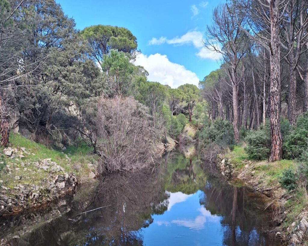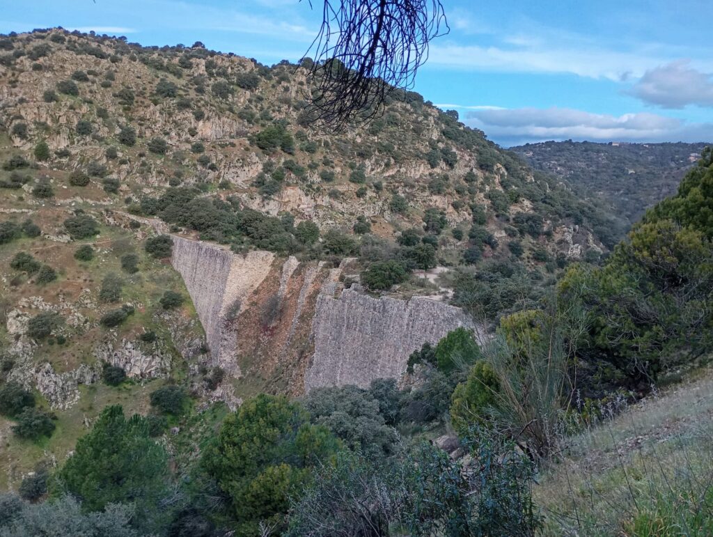 Los convocados nos reunimos en la urbanización Molino de la Hoz, cerquita de nuestro Madrid, por lo que realizamos una excursión ecológica de proximidad. En cuanto terminaron las últimas verjas de los chalets, la cuesta se empeñó en subirnos a unos pinares espectaculares que hacían cosquillas a unas nubes de algodón que flotaban en un cielo raso. Estos cielos goyescos encuadraron unas explicaciones realmente interesantes, por parte de Juan Carlos Martin, en la presa del Gascón, cuyo propósito, en tiempos de Carlos III, fue hacer posible un recorrido fluvial de Madrid a Sevilla.