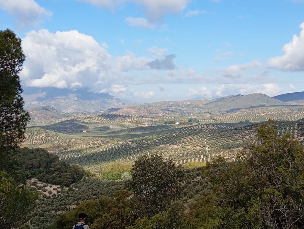 Poco antes de volver al aparcamiento, nuestro camino atraviesa una extensión olivares, donde encontramos a un auténtico aceitunero de Jaén levantando los olivos. No es un ejemplar altivo como el del poema, pero sí se muestra orgulloso de los frutos de su trabajo, al mismo tiempo que nos comparte las dificultades de hacer las cosas bien y nos aconseja adquirir aceite de forma inteligente y responsable. Mejor de cooperativa. Que no se preocupe, que así lo hemos hecho, que hemos acabado con todas las existencias aceiteras del hostal.