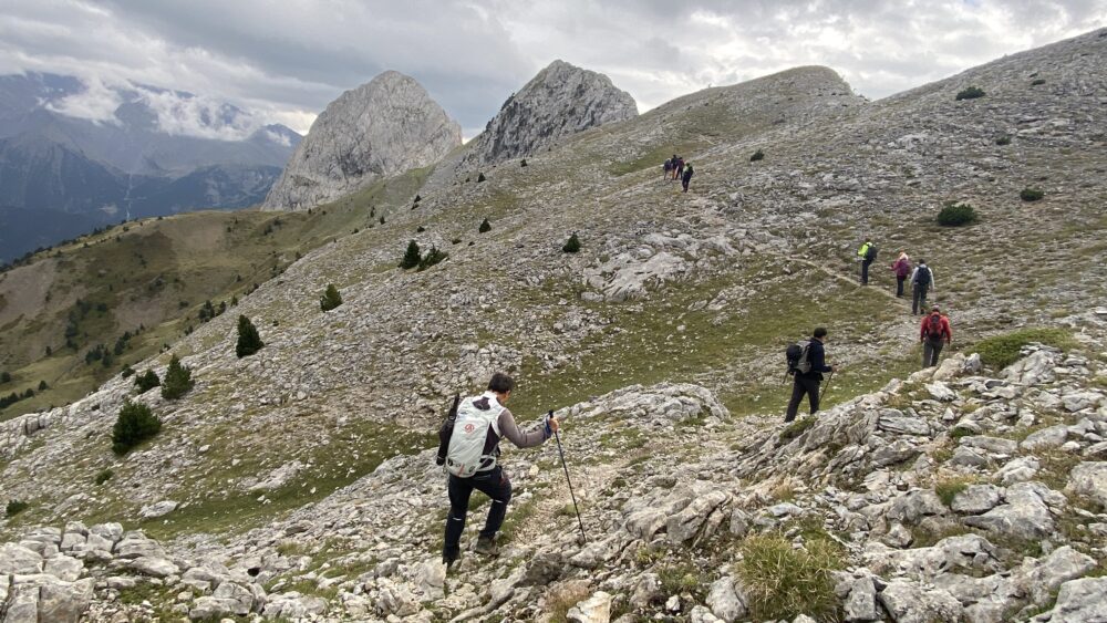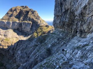 Allí mismo, decidimos seguir la ruta programada inicialmente; el camino se empinaba notablemente, serpenteando hacia nuestro siguiente objetivo y salvando un primer desnivel rocoso importante. Llegamos en unos 80 minutos a la base de la canal de Covachirizas que da acceso al collado del mismo nombre y posteriormente a un vertiginoso y estrecho “paso horizontal” a través de una pequeña faja de roca caliza.