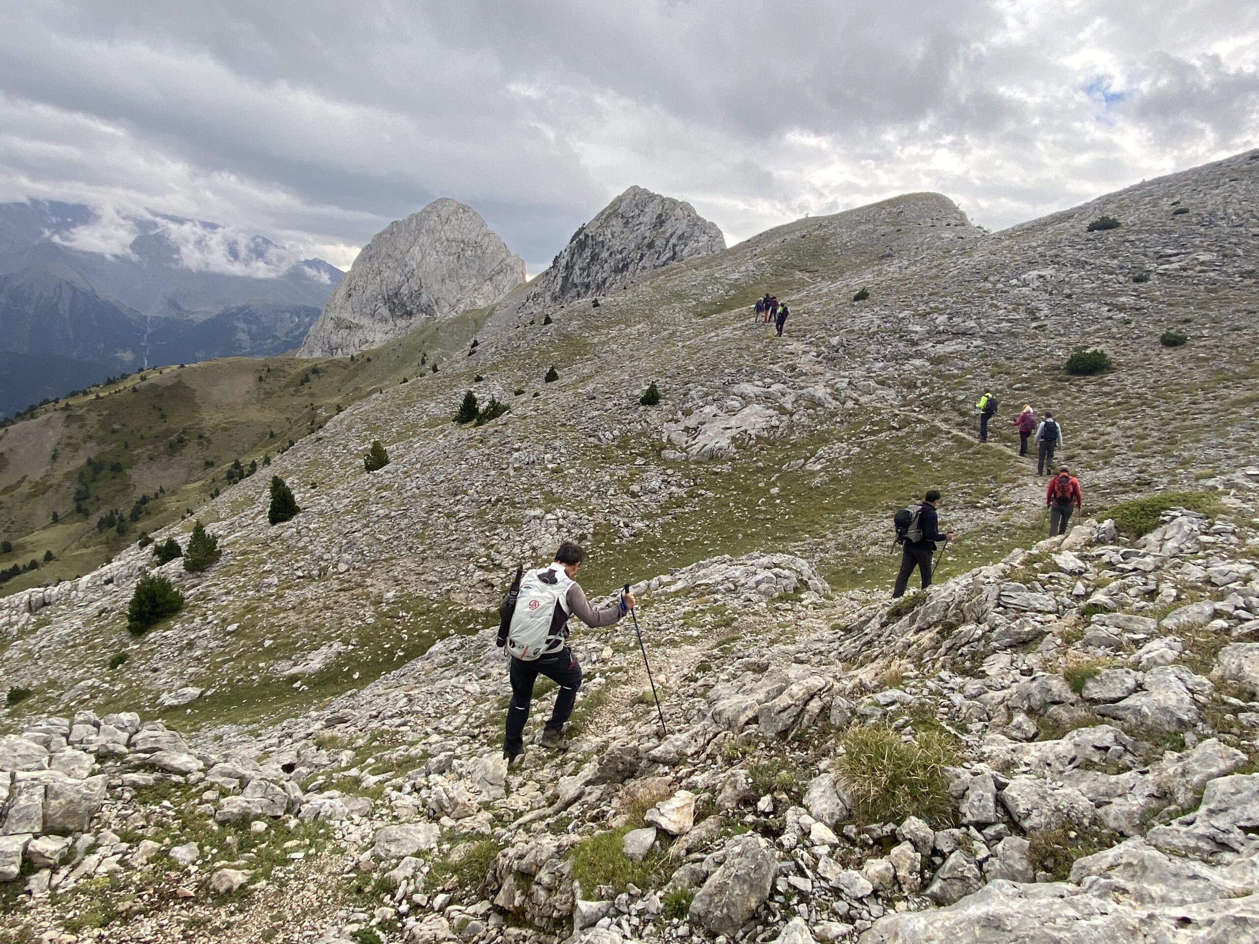 Una vez que llegamos al portillo situado entre las dos peñas principales, casi todo el grupo decidió subir a la Foratata Occidental; este tramo es de difícil acceso y peligroso, con trepadas constantes en la roca caliza y planos bastante inclinados. Mereció la pena, una vez en cumbre, las vistas son impresionantes, pudiendo divisar entre otros picos tan conocidos como Los Infiernos, Balaitus, Palas, Garmo Negro, etc.