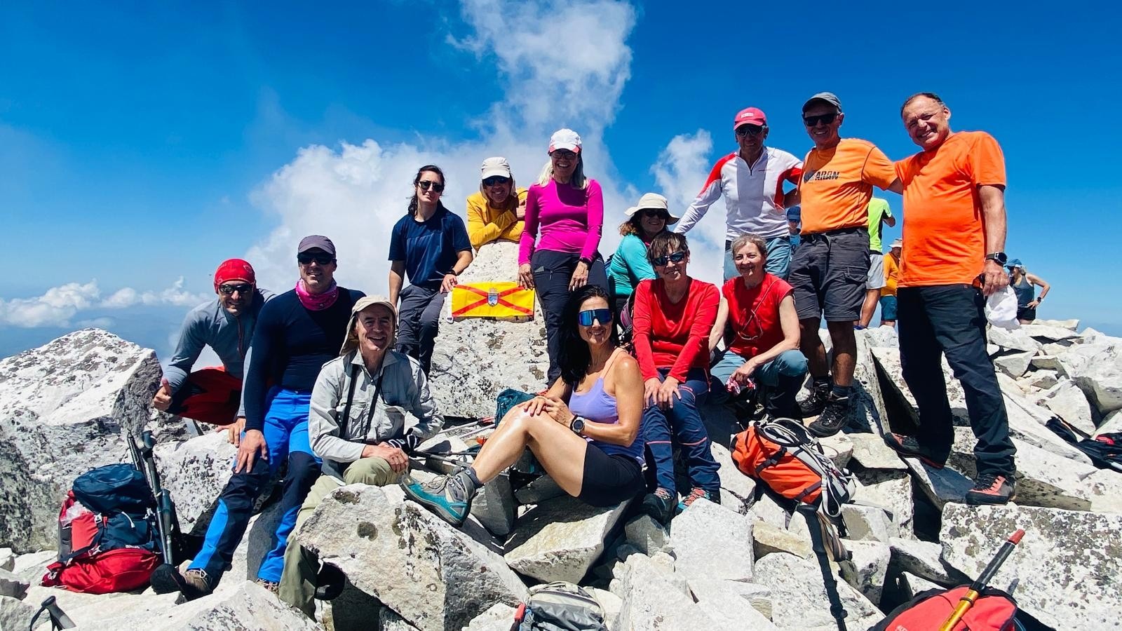 Todo el grupo consiguió hacer cima, a 3.221 m. En la cumbre, además de los abrazos y felicitaciones, cantamos el cumpleaños feliz a Ana P. Sus *4 lo merecían, y esta ocasión la recordaremos con mucho cariño. Menos mal que las vistas compensaron el esfuerzo de la subida. Habíamos invertido unas 7 horas.