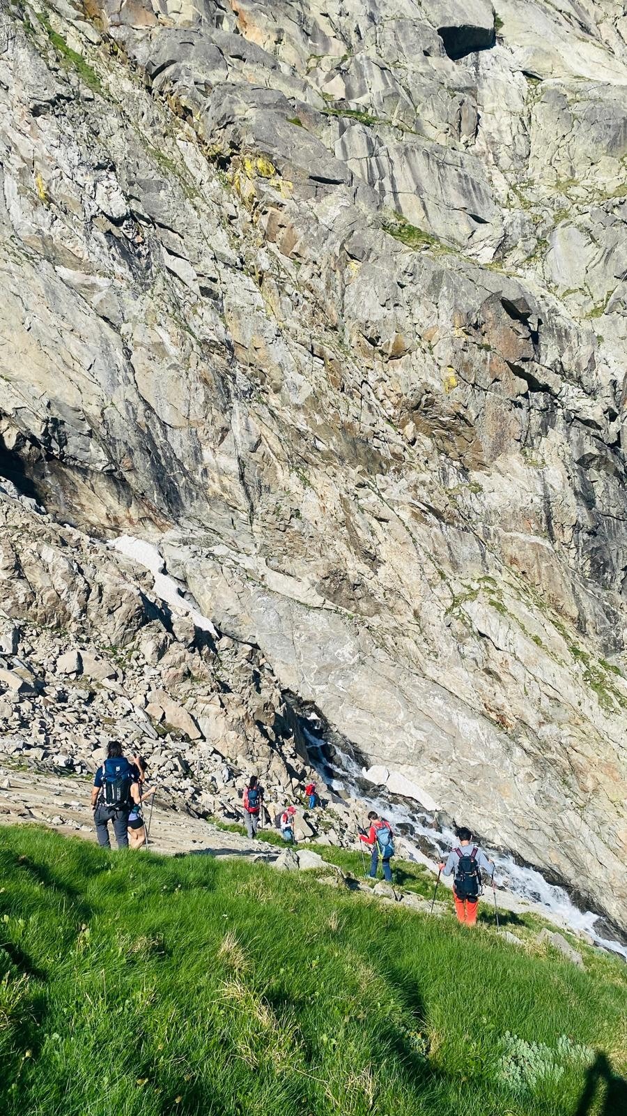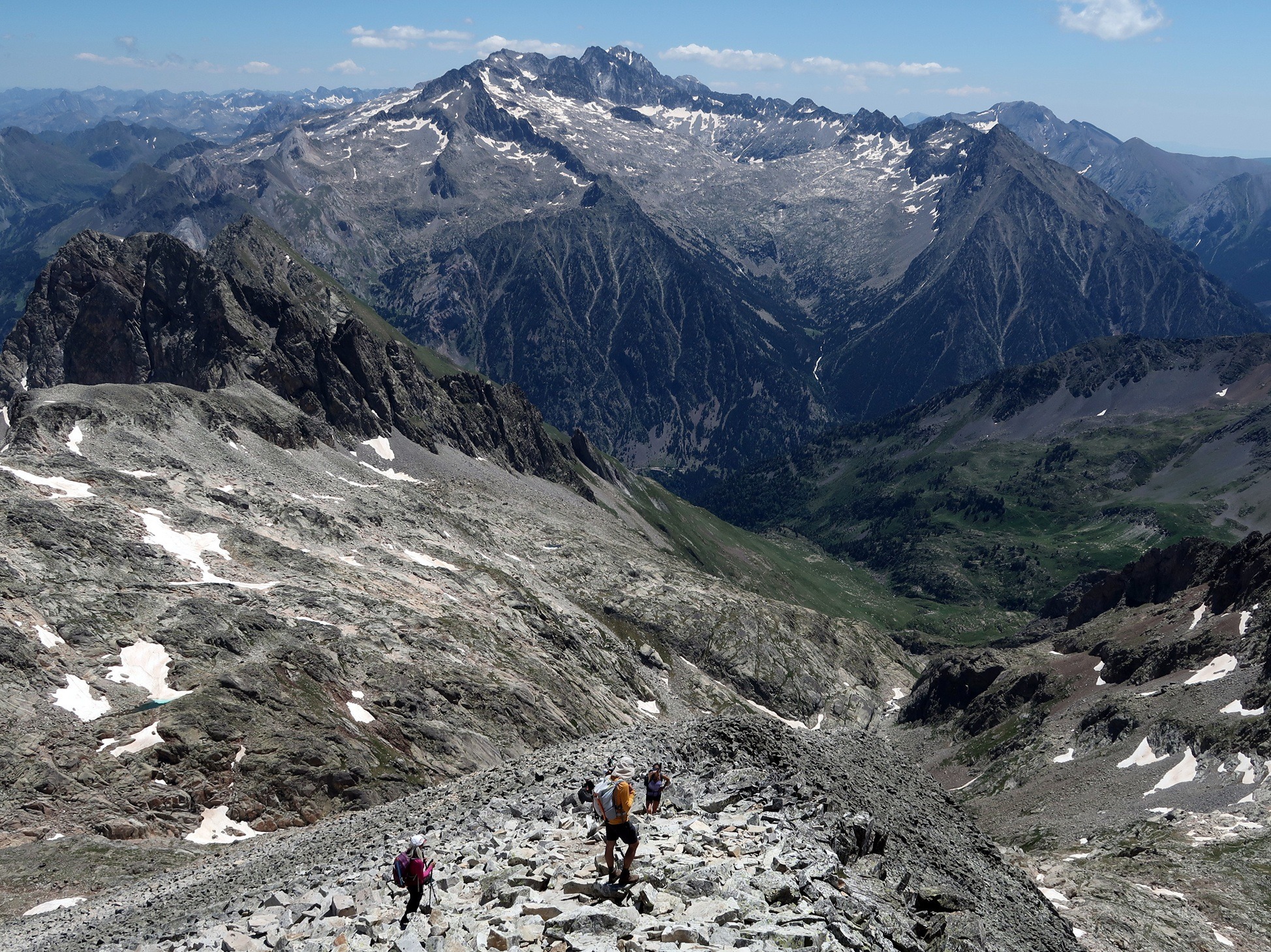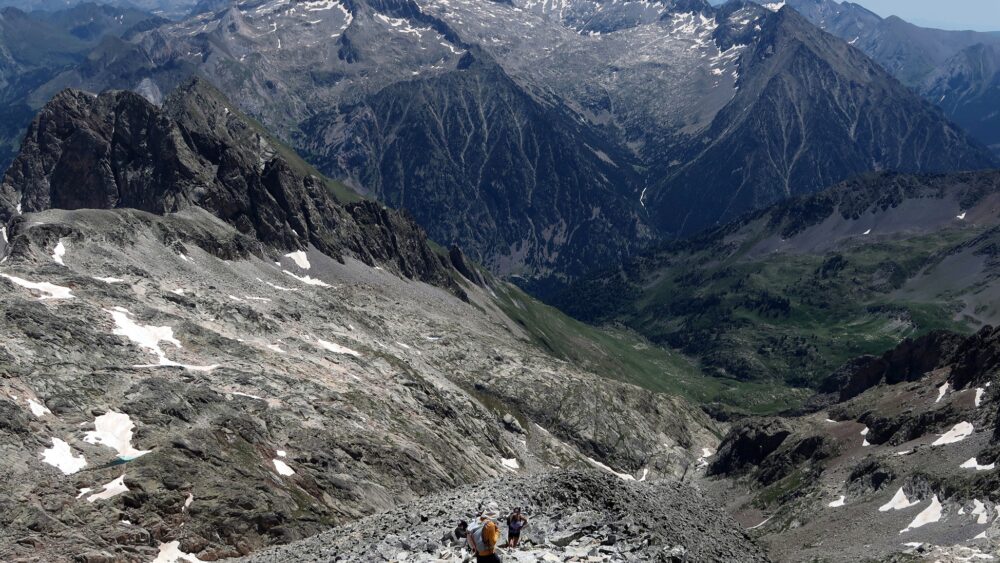 De regreso, la bajada hasta el ibón resultó exigente. Ana T. y Laura se quedaron atrás para esperar a los dos últimos rezagados, y el resto comenzamos el descenso por el valle de Lliterola. Algunos senderos, ocultos bajo los neveros, nos obligaron a hacer uso por segunda vez de los crampones. También fue algo confuso encontrar el sendero de aproximación al Ibonet de Lliterola, que finalmente superamos por su orilla norte. Una vez definitivamente encauzados, el resto de la bajada hasta la llegada a los coches se hizo larga, pero con espectaculares vistas del valle y del macizo de la Maladeta al fondo, con su exiguo glaciar. Incluso alcanzamos a divisar Marmotas. En total, más de 13 horas «bailando».