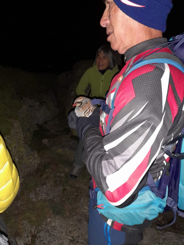Como a veces pasan cosas, pasó que Fran cazó una perdiz. Sí, no es broma, bajando a Bailanderos. Bien es cierto que la perdiz estaba lesionada en una pata. Cuando lo dijo, todavía de noche y con el grupo estirado, algunos creíamos que iba de chota, pero no, cuando el grupo se junto en una de esas paradas técnicas porque el terreno se pone difícil, apareció con la perdiz entre sus manos, haciendo equilibrios entre los bloques que atravesábamos. Qué decir, sino que se estableció un debate sobre si la perdiz debía quedarse o continuar con nosotros. Al final, prevaleció la postura de Fran que, tras hacernos sufrir un poco, la liberó encima de una piedra, tras lo cual el ave se escabullo como pudo, dejándonos la duda de si sobreviviría.