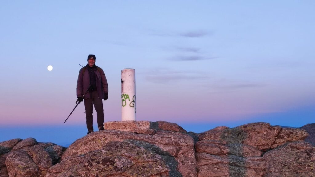 Por supuesto, para no morir en el intento, hicimos un par de paradas: una, a la bajada de Cabeza Mayor, en un pequeño berrueco que hay en la Loma del Pandasco, donde cenamos allá sobre las 3 de la madrugada, mientras nos protegíamos de un vientecillo frío del sur, y otra en el alto de Narraja, cuando amanecía, para descansar algo, buscando, para atenuar el frío viento, el tenue sol que apenas calentaba, arrejuntándonos debajo de la cima como si fuéramos una colonia de pingüinos.