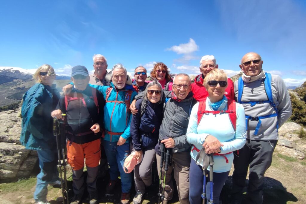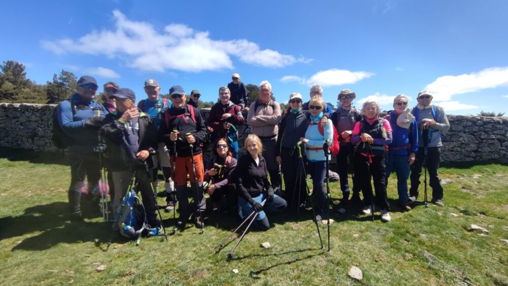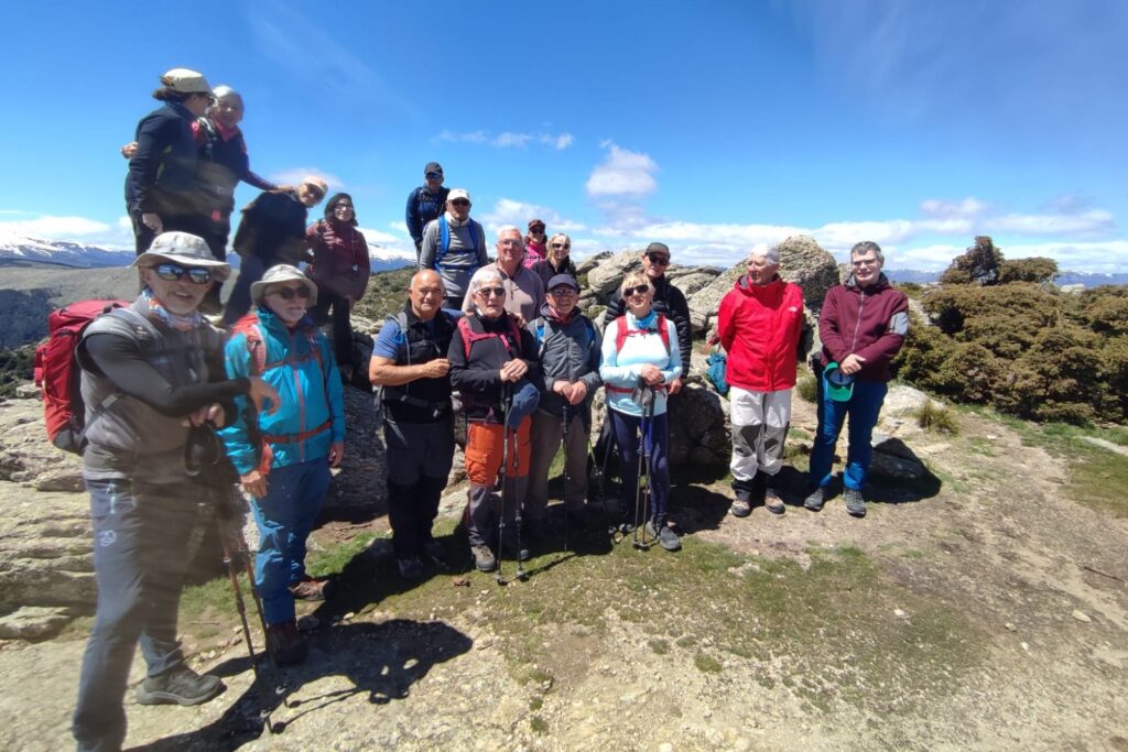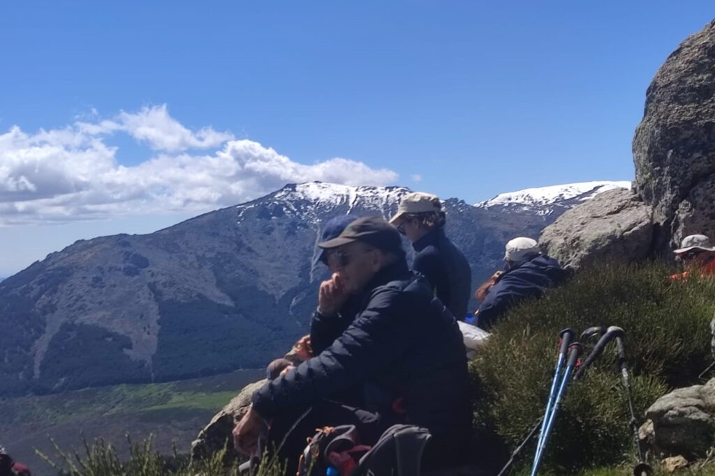 Continuamos con el ascenso para alcanzar la cumbre del cerro de la Genciana. Desde este cerro las vistas eran espectaculares; la imagen de la Maliciosa y Peñalara, con bastante nieve todavía en sus cumbres, y el contraste del cielo azul con alguna nube junto con el verde intenso del campo nos hizo que muchos de nosotros sacásemos el móvil e hiciésemos la foto panorámica del día. No tardamos nada en llegar al punto geodésico que marcaba la Perdiguera, donde aprovechamos a comer, eso sí resguardados del aire entre las rocas.