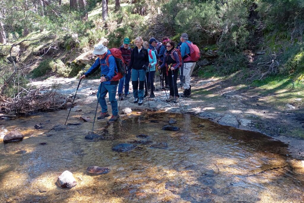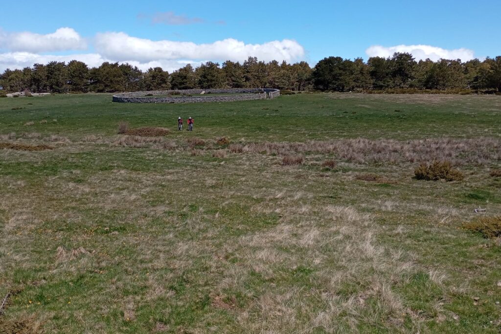 Nos encaminamos por una senda de subida hasta llegar al puerto de Canencia. Allí nos encontramos con muchos ciclistas y también con algunos coches que aparcaban al lado de la valla que rodeaba la fuente, nos sorprendió y asustó un conductor que sin ningún miramiento aceleró para salir de la pista de modo brusco… Repusimos agua y fuerzas picando algún fruto seco y continuamos marcha. Fuimos con precaución por la pista porque bajaban bicis a gran velocidad. Llegamos al edificio abandonado de un centro de interpretación, dejamos el tramo de pista y continuamos subiendo por un pinar, en algunos momentos se perdía la senda y fuimos buscando la mejor manera de llegar al prado del Toril; como indica su nombre nos encontramos con la edificación de un muro circular que se usaba como toril.
