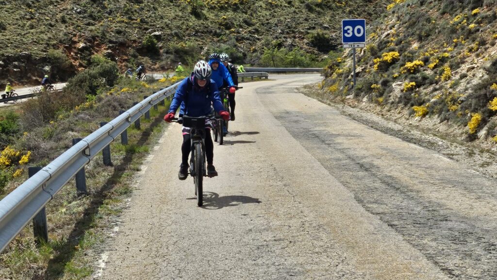 Efectívamente, el sábado salimos de Campisábalos helados, con 5º y algo de lluvia y viento, pero, por suerte, el sol salía de vez en cuando para hacernos la jornada más agradable. La ruta estaba programada para llevar alforjas, de ahí que incluyera bastante asfalto, pero resultó placentero pedelear por las carreteras pues son sumamente tranquilas. Tuvimos algún camino con barro, pero transitable, y algún que otro perro guardián de ovejas nos salió al paso, pero, por suerte no hubo problema.