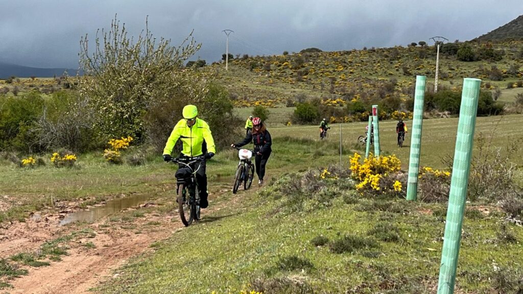 Efectívamente, el sábado salimos de Campisábalos helados, con 5º y algo de lluvia y viento, pero, por suerte, el sol salía de vez en cuando para hacernos la jornada más agradable. La ruta estaba programada para llevar alforjas, de ahí que incluyera bastante asfalto, pero resultó placentero pedelear por las carreteras pues son sumamente tranquilas. Tuvimos algún camino con barro, pero transitable, y algún que otro perro guardián de ovejas nos salió al paso, pero, por suerte no hubo problema.