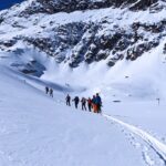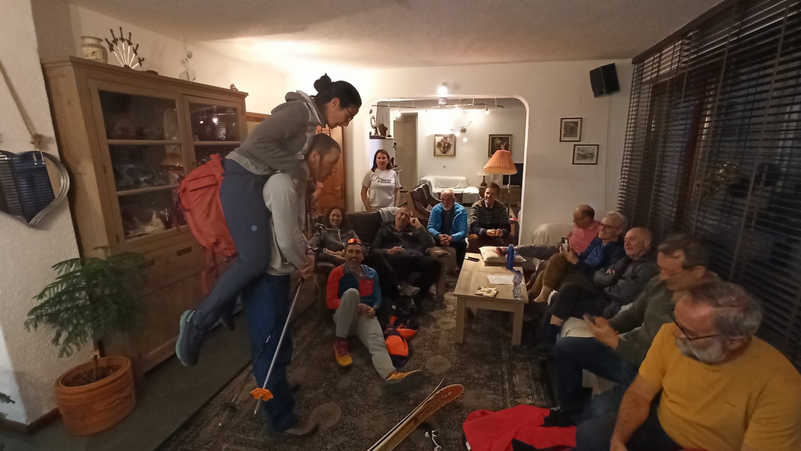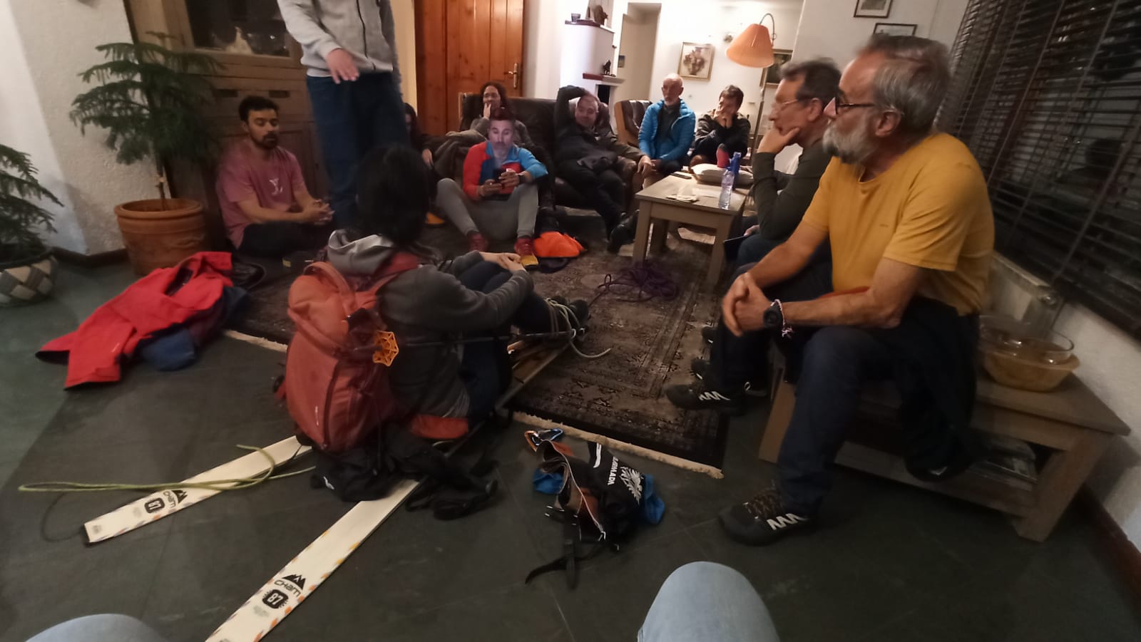 Pero aún tiene sorpresas : alojados en un pequeño hotel familiar, tras la cena nuestro guía Martín nos da una charla sobre seguridad en montaña invernal, aludes y búsqueda de víctimas, que nos permite tener una visión muy sencilla y completa de la complejidad de los riesgos que asumimos y cómo minimizarlos ; quedamos muy agradecidos por sus explicaciones !