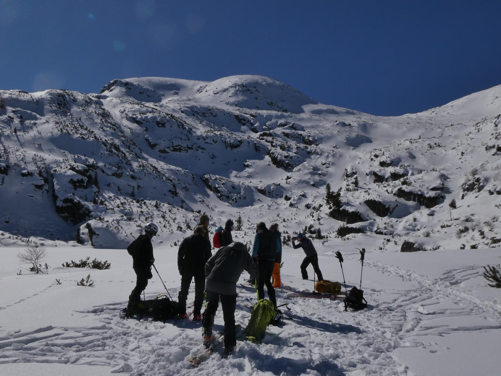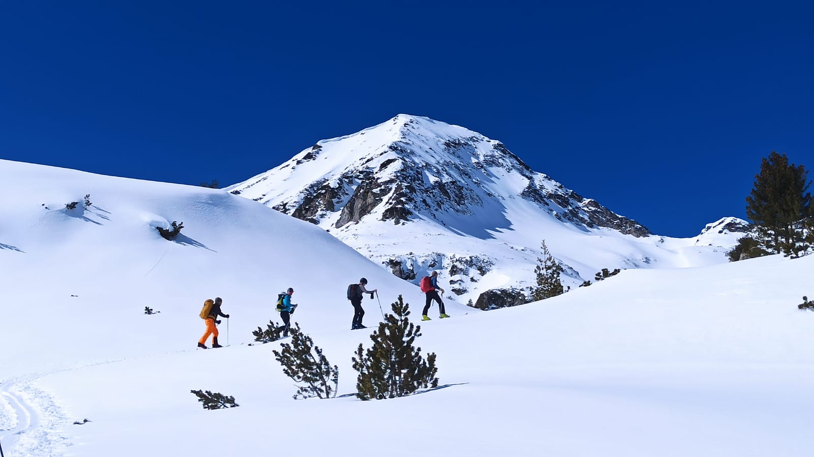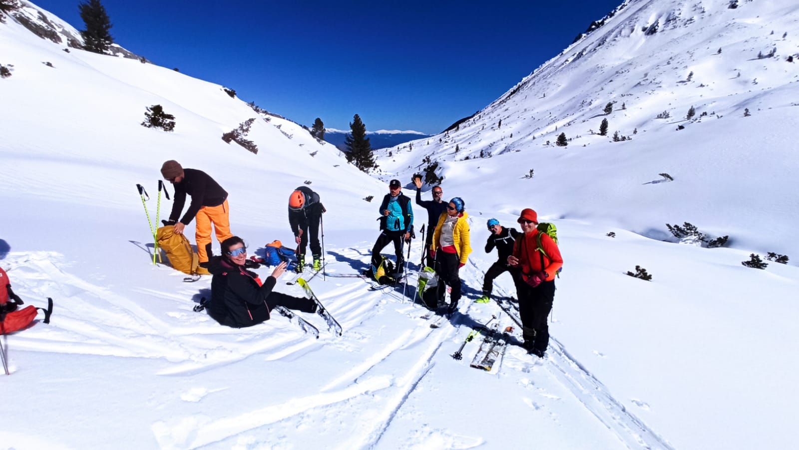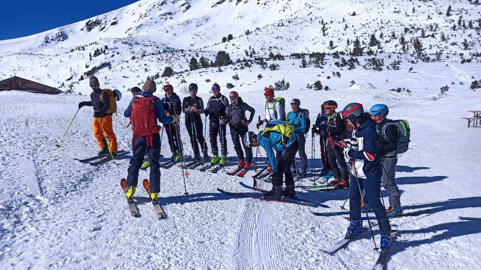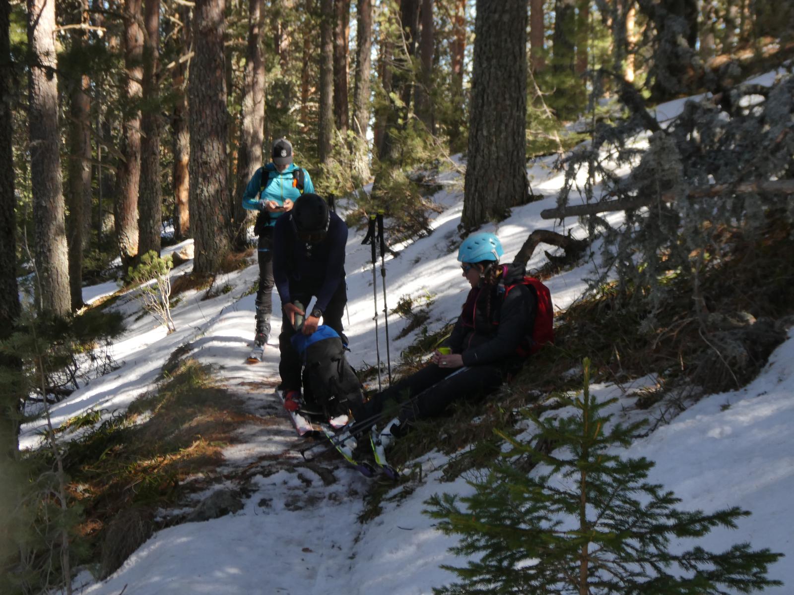 Vamos perdiendo altura por diagonales y entretenidas palas con nieves de todo tipo hasta entrar de nuevo en el bosque y utilizando la huella de subida llegamos suavemente hasta el inicio, donde todo el grupo se reencuentra alrededor de unas cervezas.
