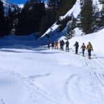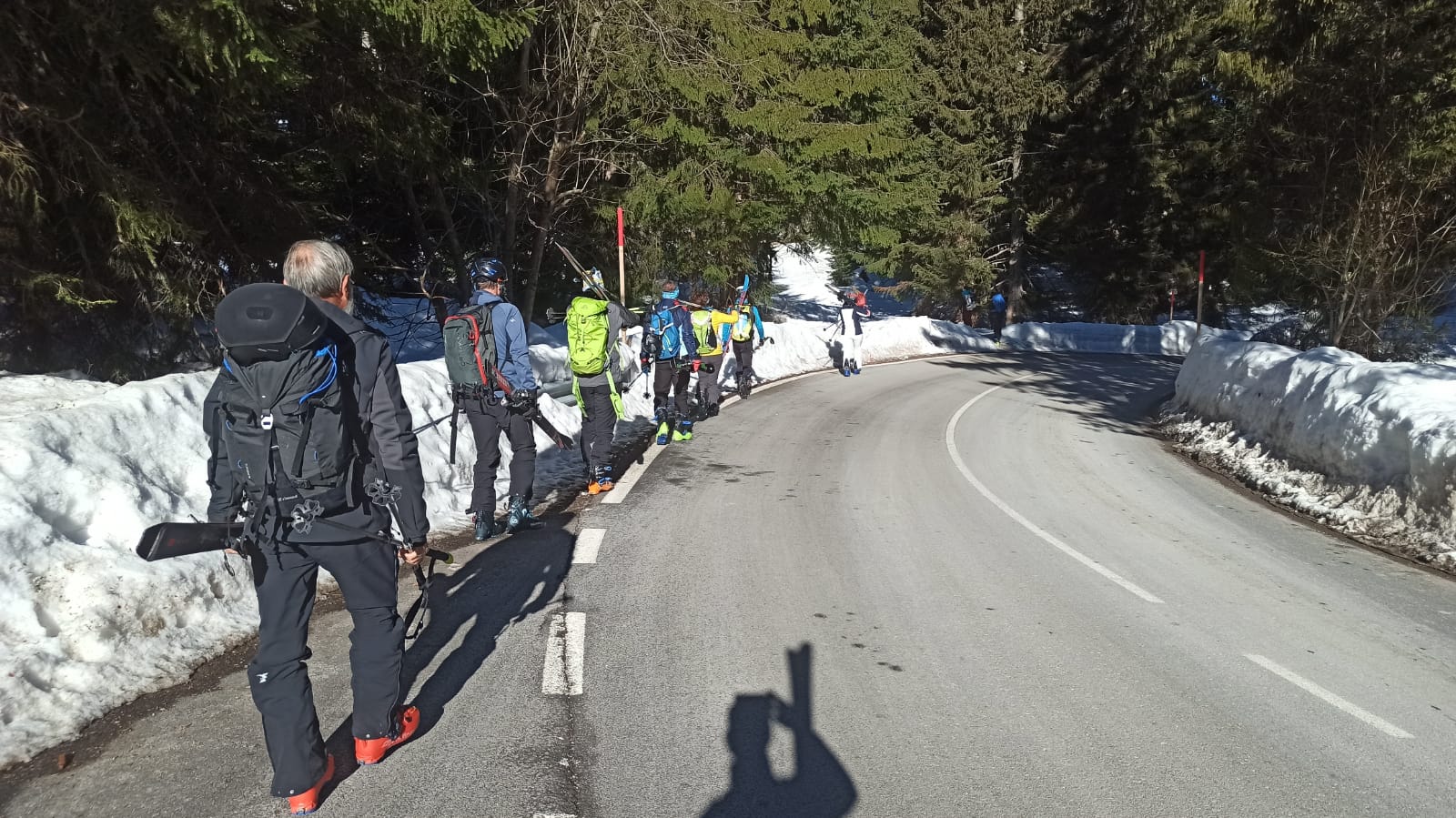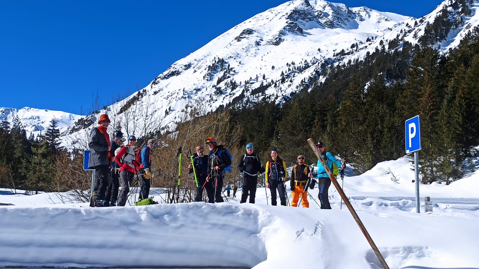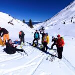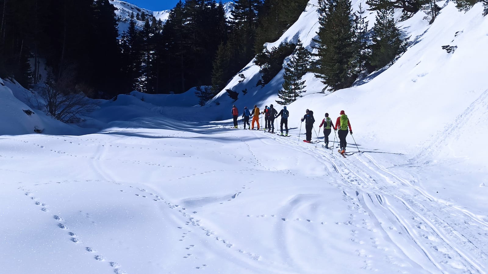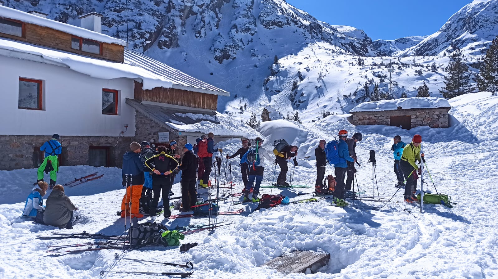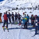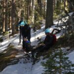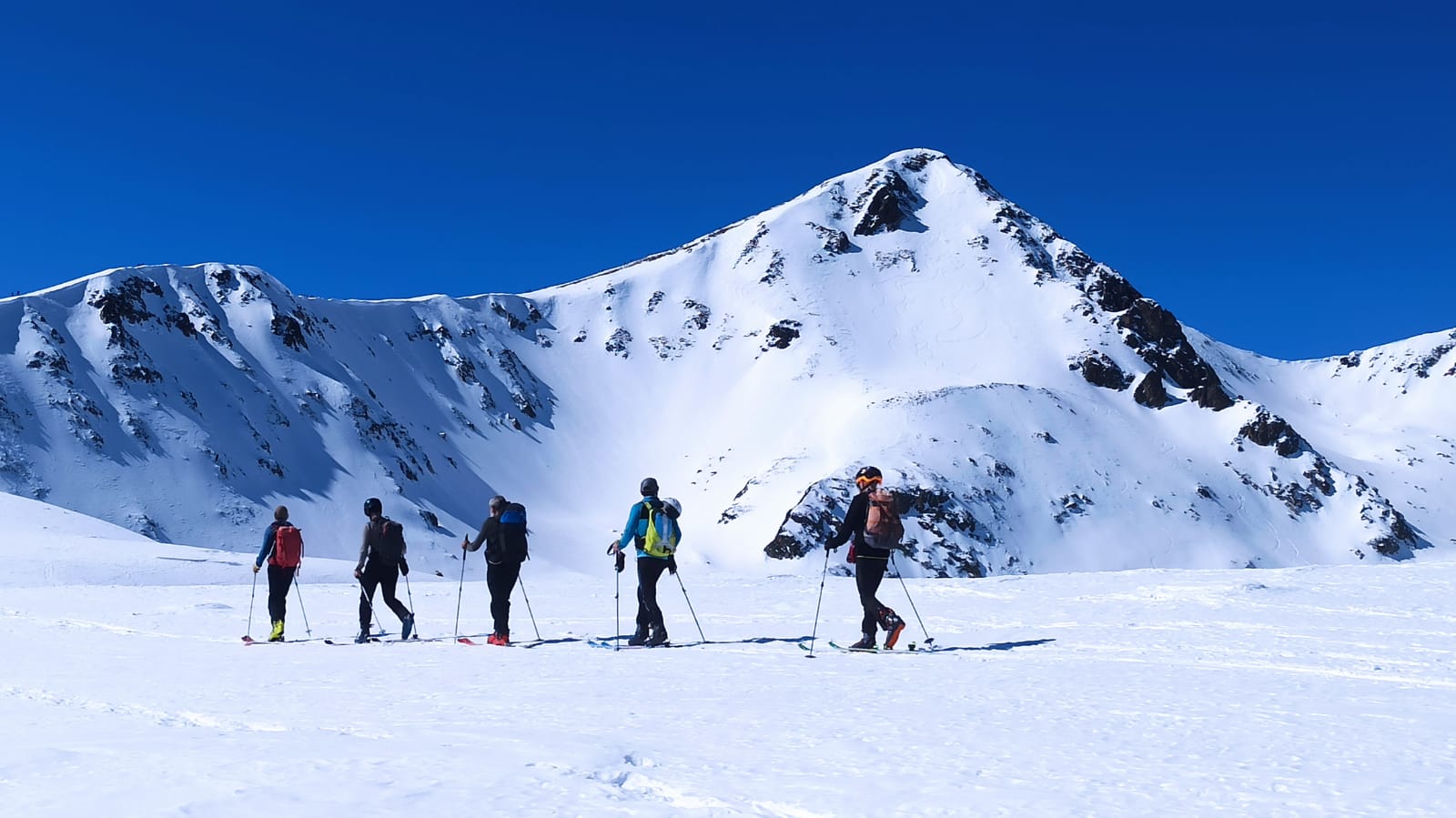 Vamos perdiendo altura por diagonales y entretenidas palas con nieves de todo tipo hasta entrar de nuevo en el bosque y utilizando la huella de subida llegamos suavemente hasta el inicio, donde todo el grupo se reencuentra alrededor de unas cervezas.