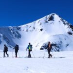 Continuamos hasta un collado entre los picos Bezbog y Polezhán, y tras 300 m de desnivel, iniciamos un precioso descenso por un amplio corredor con nieve polvo, que resulta más sencillo de lo que amenazaba por su inclinación.