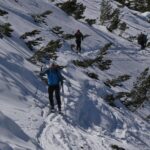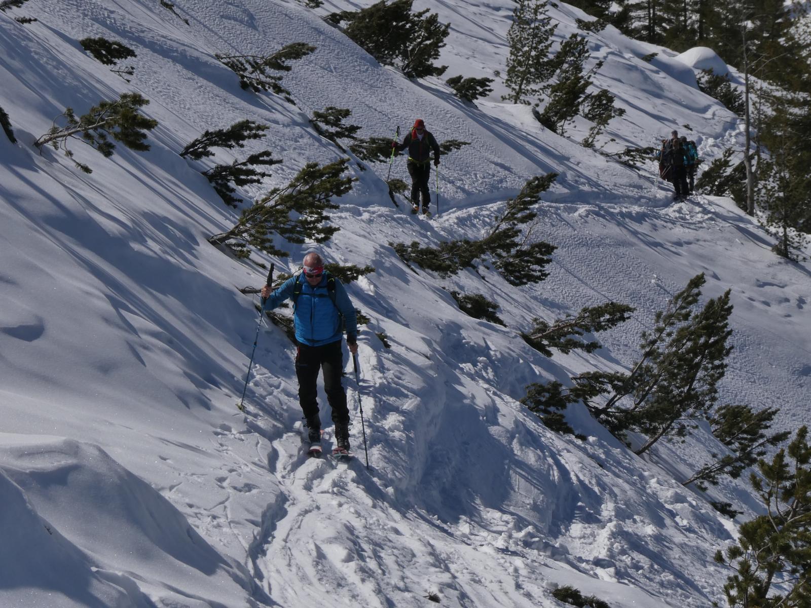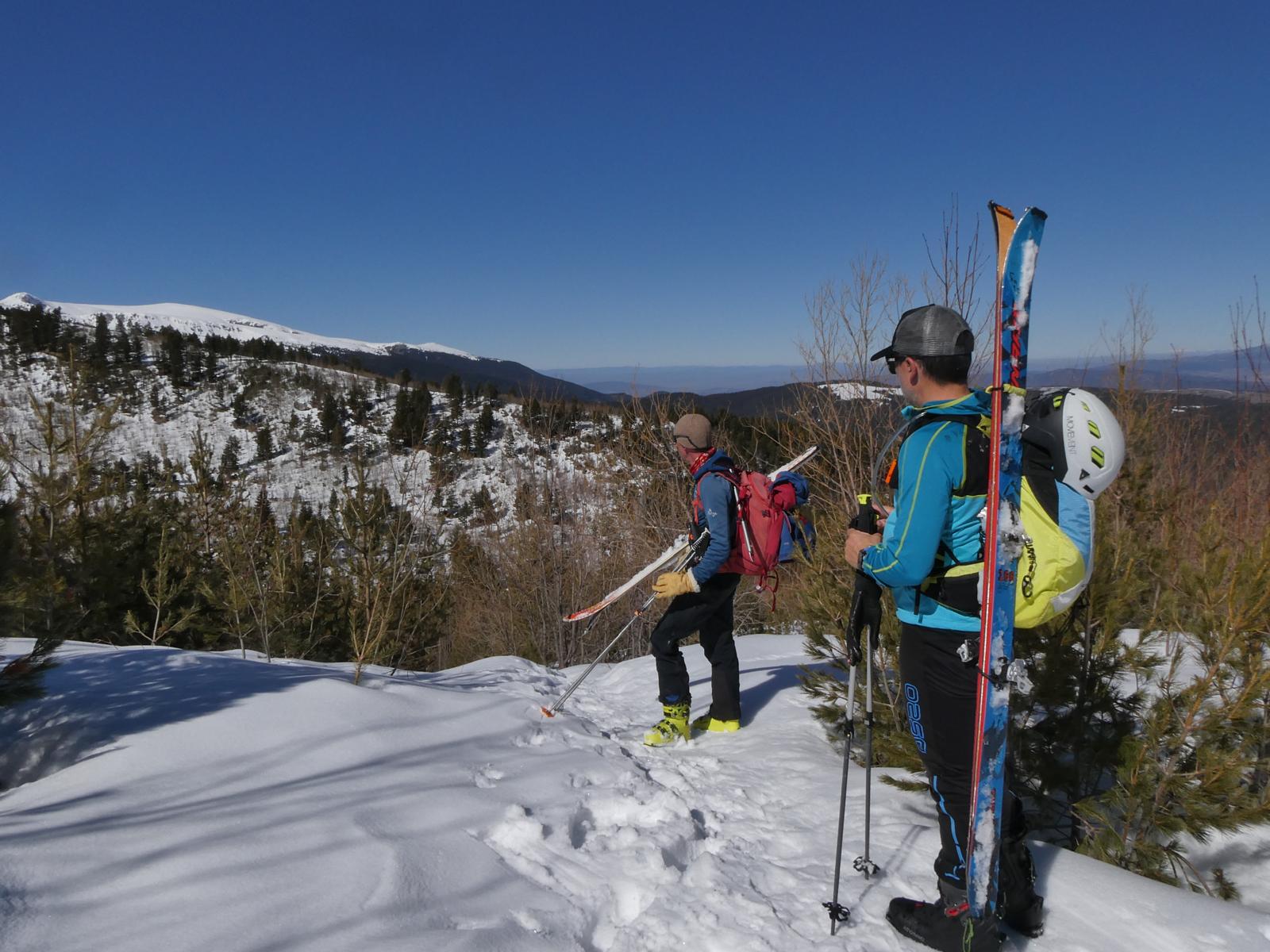 Aquí volvemos a poner pieles para remontar entre pinos unos 100 metros de desnivel y llegar al punto de partida, la estación superior del telesilla.