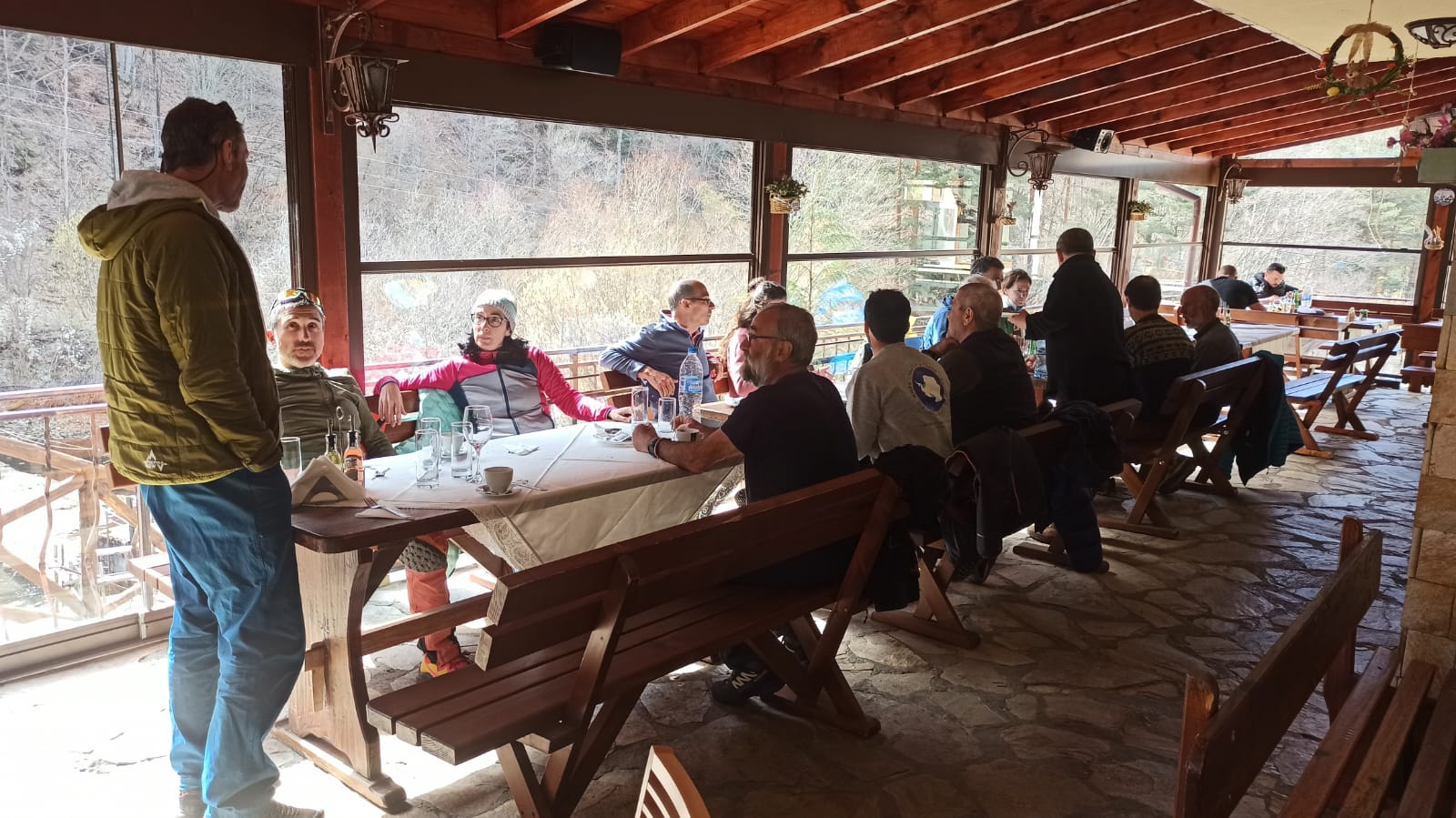 En su pequeña estación de esquí se queda Cristina, y desde allí con pleno sol, frío y sin viento, iniciamos la ruta de hoy, que se inicia en bosque y cuando termina apetece el refugio de Malyovitsa, donde hacemos una parada.
