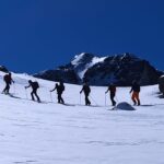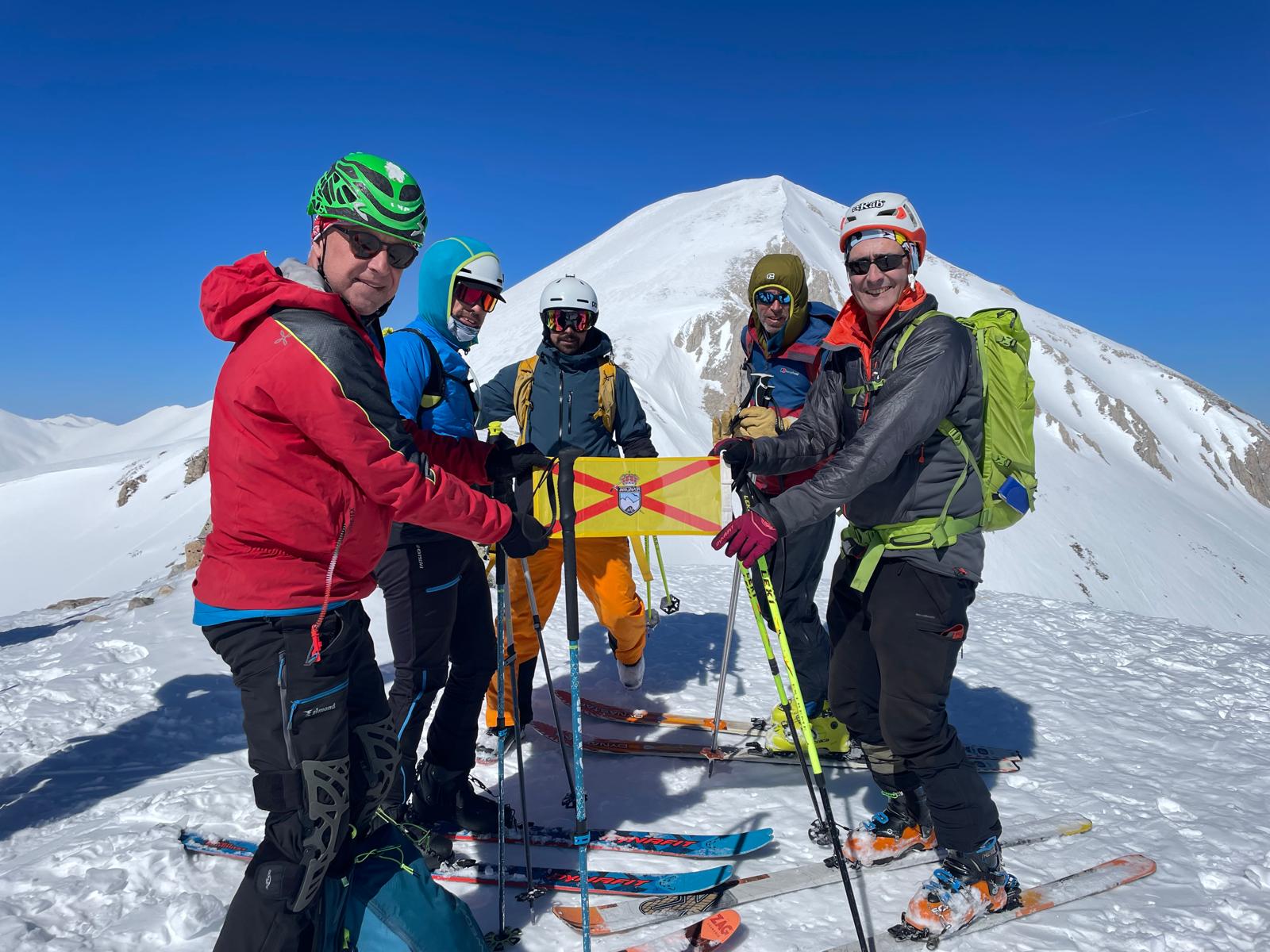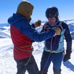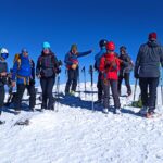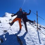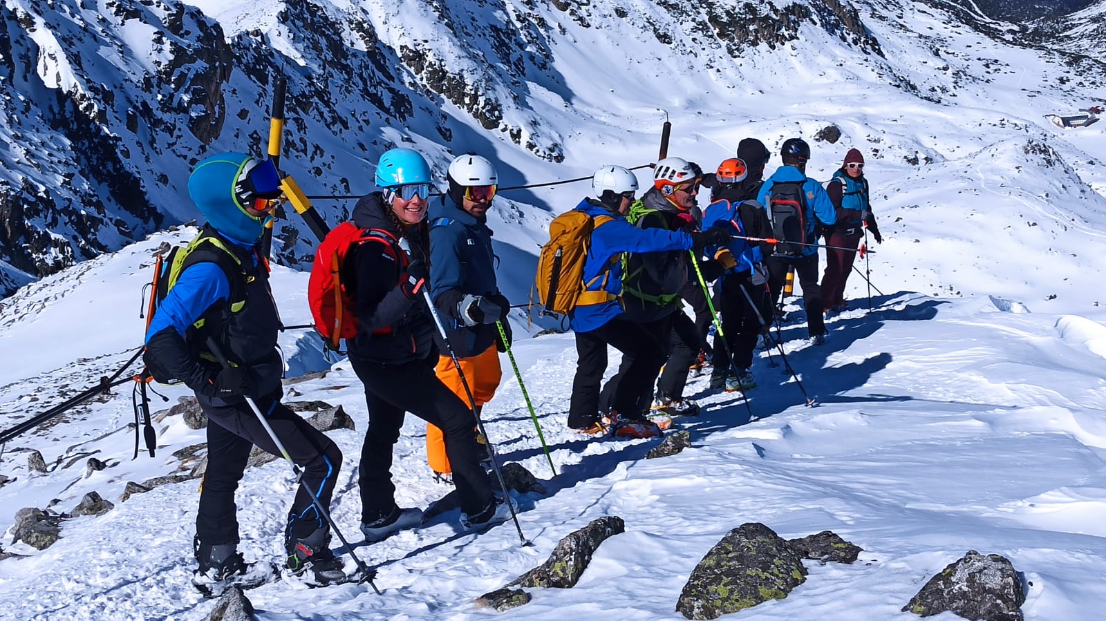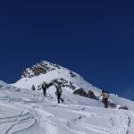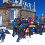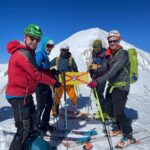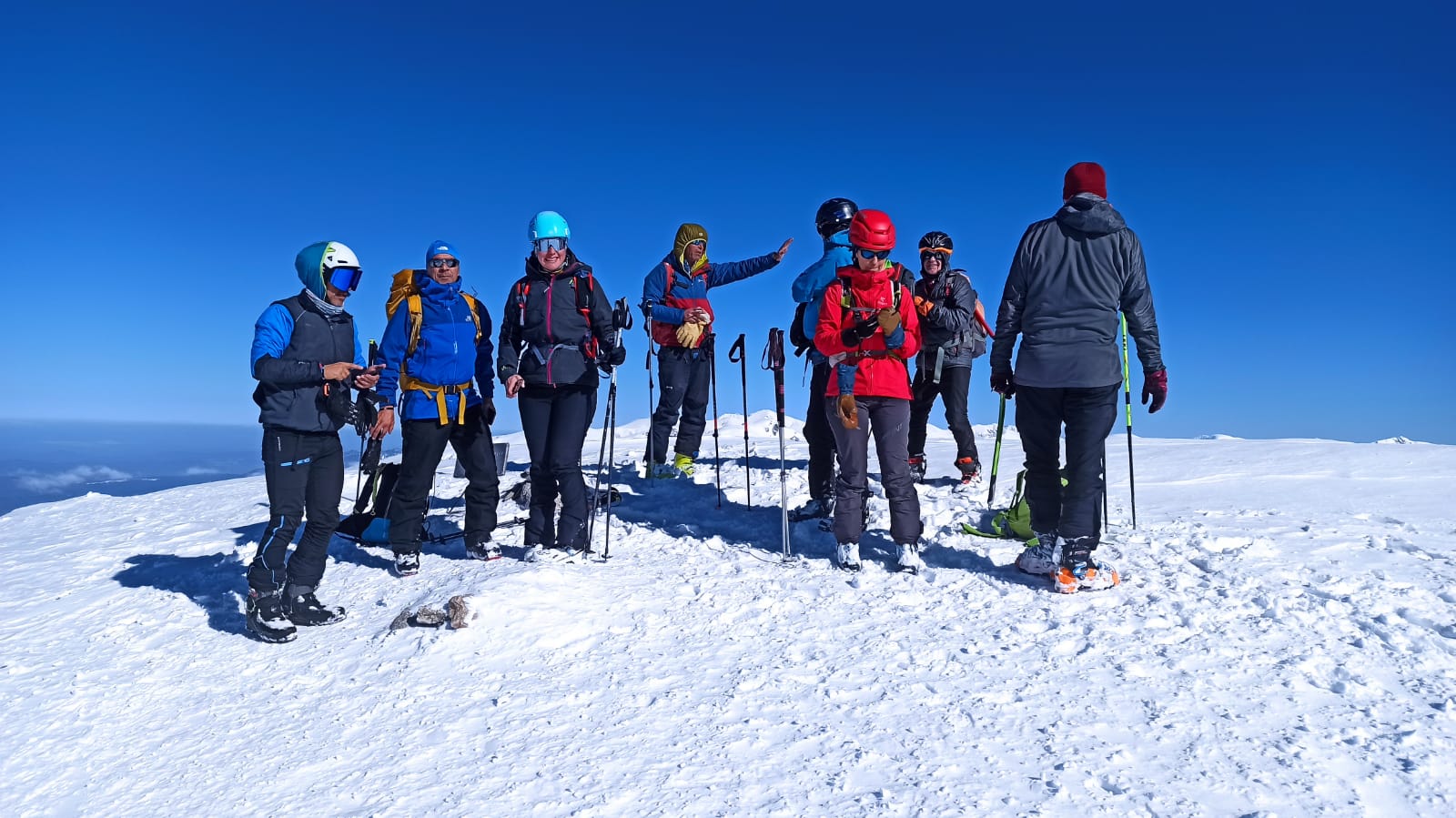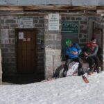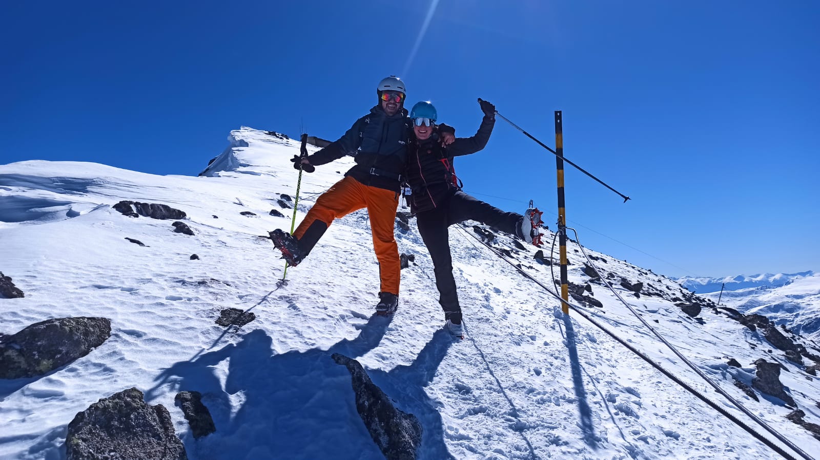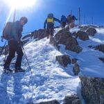 Bajo la arista final hacemos una ultima parada en un refugio. Quitamos esquís y ponemos crampones para subir unos 150 m de desnivel por una empinada y afilada arista, protegida por un cable hasta la cima.