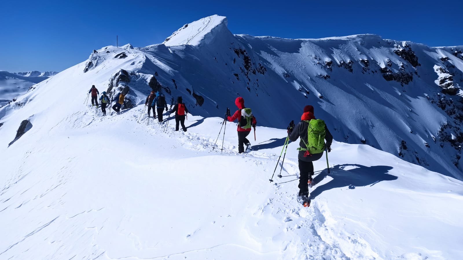 Ultimas palas nos llevan a una arista amplia y casi horizontal donde dejamos los esquís, y continuamos caminando por ella hasta la cima del Malyovitsa (2.927 m).