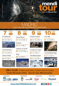 Llega a Madrid la 10ª edición del MENDI TOUR, el ciclo de cine de montaña y aventura que presenta las mejores películas del festival BBK Mendi Film Bilbao-Bizkaia. El Mendi Film cuenta una vez más con el patrocinio de la Real Sociedad Española de Alpinismo Peñalara entre otros patrocinadores y es una cita imprescindible para los amantes de la montaña y las actividades de naturaleza, y también para los aficionados al cine documental.