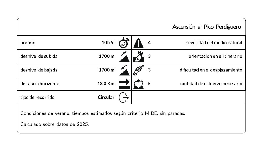 ITINERARIO: Ascensión al Pico Perdiguero ( 3.219 m) : Ruta circular, saldremos del parking de Remuñe situado al final de la carretera A-139 entorno al PK 72 y ascenderemos por el valle de Remuñe al Pico Perdiguero, descenderemos por el valle de Literola hasta llegar de nuevo a la carretera A-139 donde habremos dejado un coche que nos lleve al PK 72 y evitar andar el tramo de carretera.