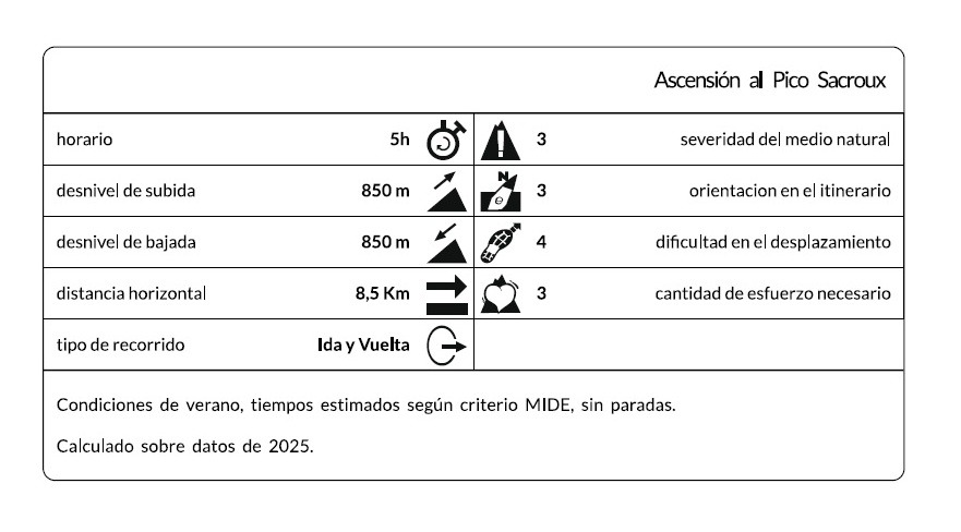 ITINERARIO: Ascensión al Pico Sacroux (2.668 m) : Salimos desde el parking del final de la carretera A-139, seguiremos sendas y caminos pasando por el ibón de Gorgutes el puerto de la Glera para ascender al Pico Sacroux. La vuelta se realizará por el mismo camino de ida.