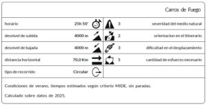 Entre 1987 a 2000, Carros de Fuego fue un juego de complicidad entre los guardas, compartido con algunos montañeros. A partir del año 2000, la travesía se institucionalizó y se hizo realmente popular. Desde entonces, puede realizarse en el tiempo que cada persona desee y se considera dentro de la categoría «Open». En cada refugio, es posible sellar una tarjeta de paso adquirida previamente. El itinerario propuesto se detalla a continuación.