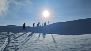 Repaso de la técnica correcta para la vuelta maría. ○ Vuelta progresiva perfeccionada ○ Vuelta maría inversa o al valle ○ Vuelta maría con apoyo exterior ● Ascenso por diferentes terrenos y dificultades. Seguridad ● Manejo del ARVA ● Rescate de víctimas en avalancha. Práctica ● Técnica y Virajes fuera pista: Stem, 4×4, salto, etc… ● Uso de Crampón piolet en zonas técnicas.