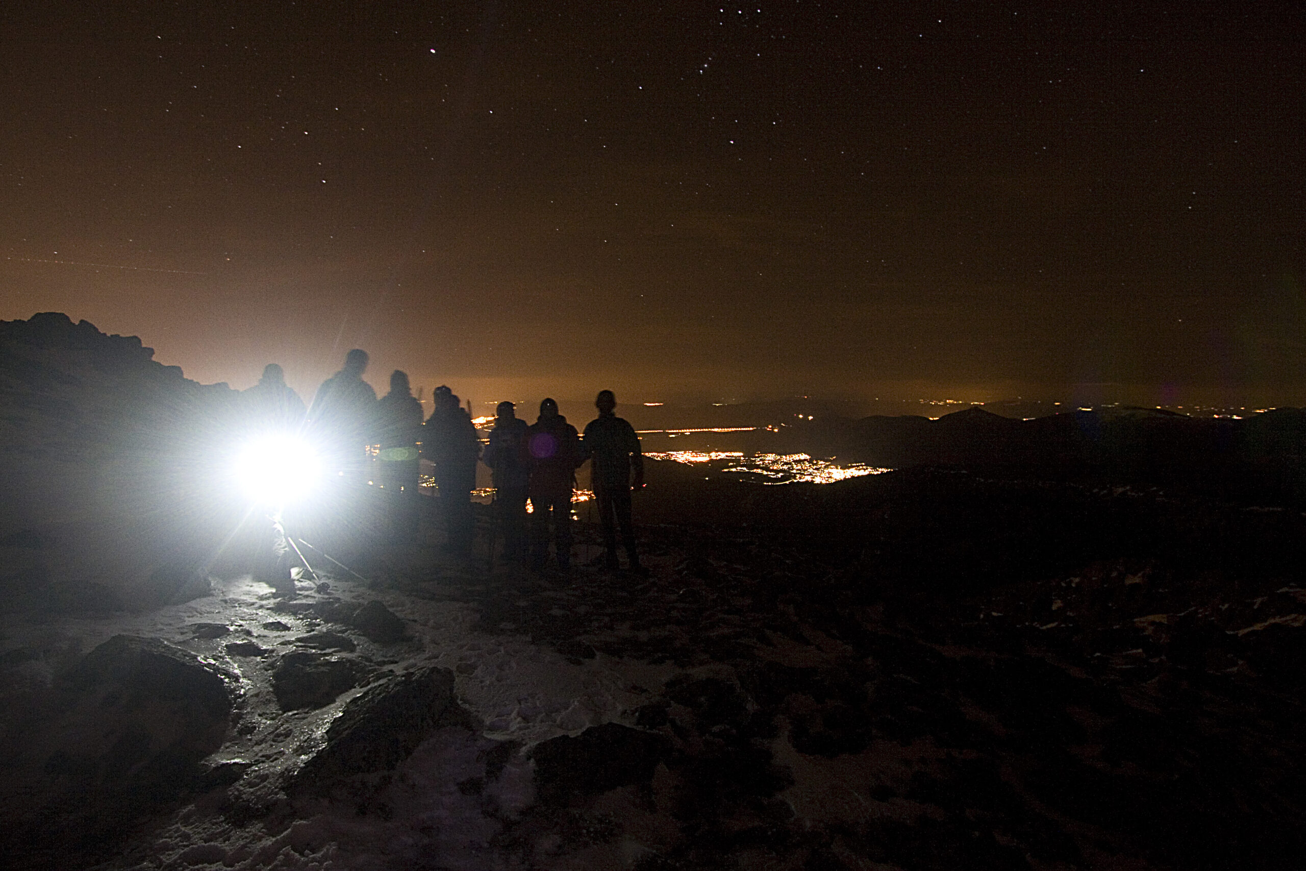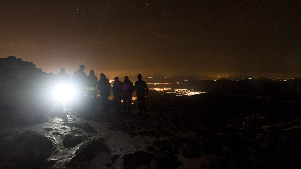 MATERIAL OBLIGATORIO: teniendo en cuenta el clima tan variable que estamos experimentando últimamente, y la gran diferencia de temperatura que se puede dar entre el día y la noche, así como entre la ciudad y la montaña, el mensaje es: «mejor dejar cosas en el coche si no hacen falta que pasar frío y ponerse en riesgo en las cumbres». Se recomienda ropa de abrigo incluyendo gorro, guantes y abrigo resistente al viento y a la lluvia. Llevar linterna frontal con pilas de repuesto y calzado resistente igualmente a la lluvia. Llevad algo de comida ligera a vuestra elección que os permita recuperar fuerzas durante la actividad, así como una cantimplora con agua.