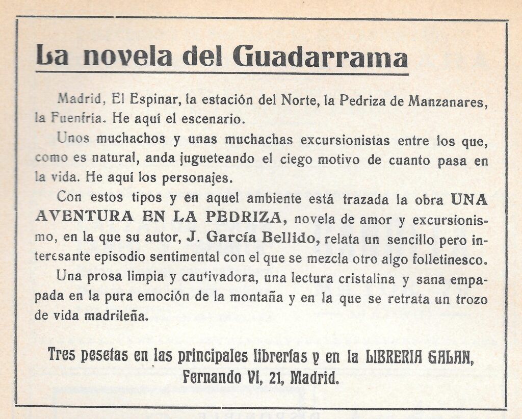 En mayo de 1924 aparece en la revista Peñalara la publicidad para venta del libro escrito por Joaquín García Bellido, uno de los socios fundadores de Peñalara once años antes.