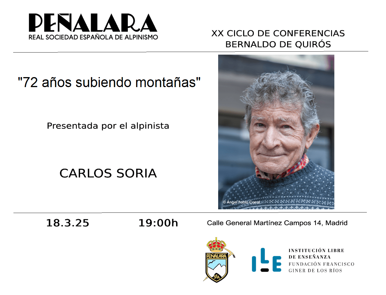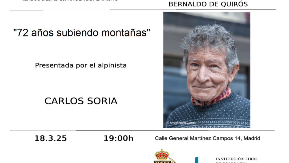 Dentro del XX Ciclo de Conferencias Bernaldo de Quirós el alpinista Carlos Soria hará un recorrido de los 72 años de escaladas y ascensiones, tanto a montañas y paredes españolas, como en las cordilleras más emblemáticas e imponentes del resto del mundo.